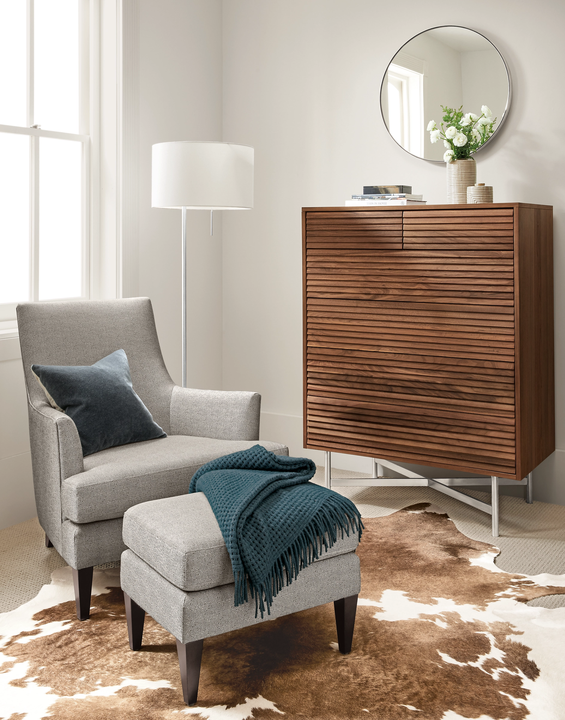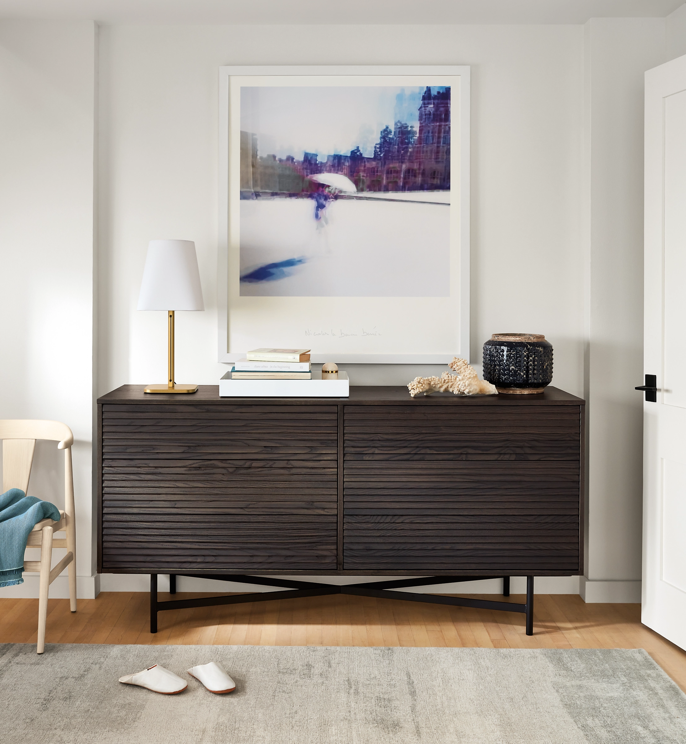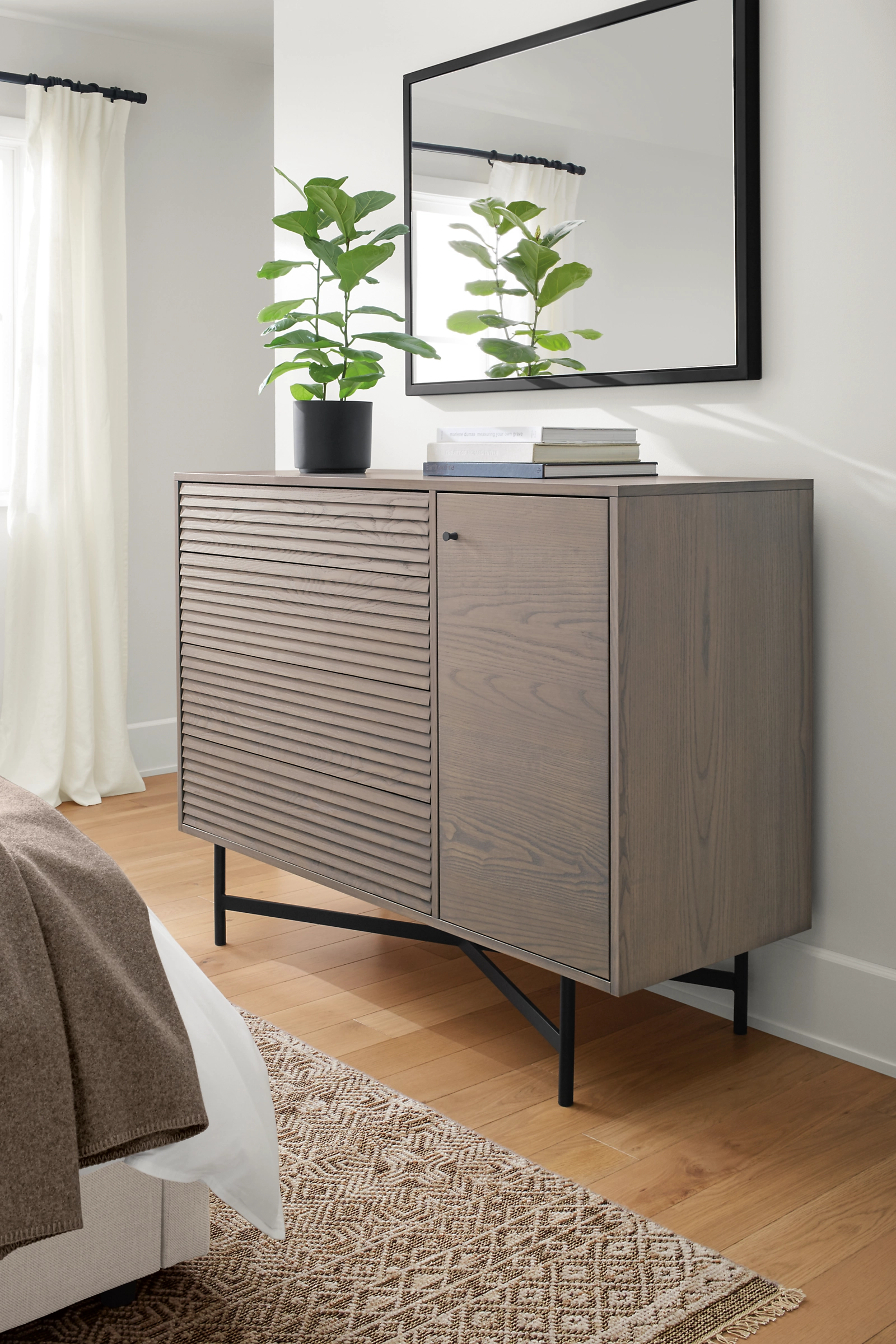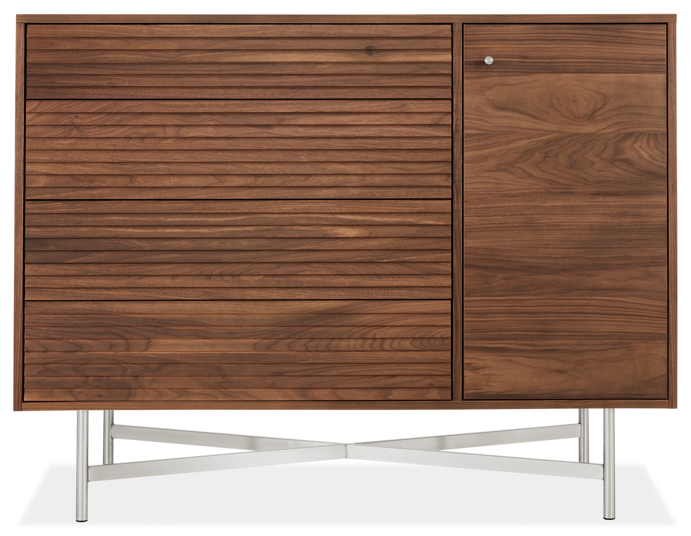 Make a statement with the Adrian dresser. Louvered drawers crafted from solid wood panels add unexpected texture and feature push-to-open functionality. The dresser’s case is crafted entirely of domestically sourced veneer and sits atop a unique X-base steel frame with rounded tube legs. Beautiful and extremely well made of U.S. and imported materials, Adrian is a unique testament to modern design and American craftsmanship.