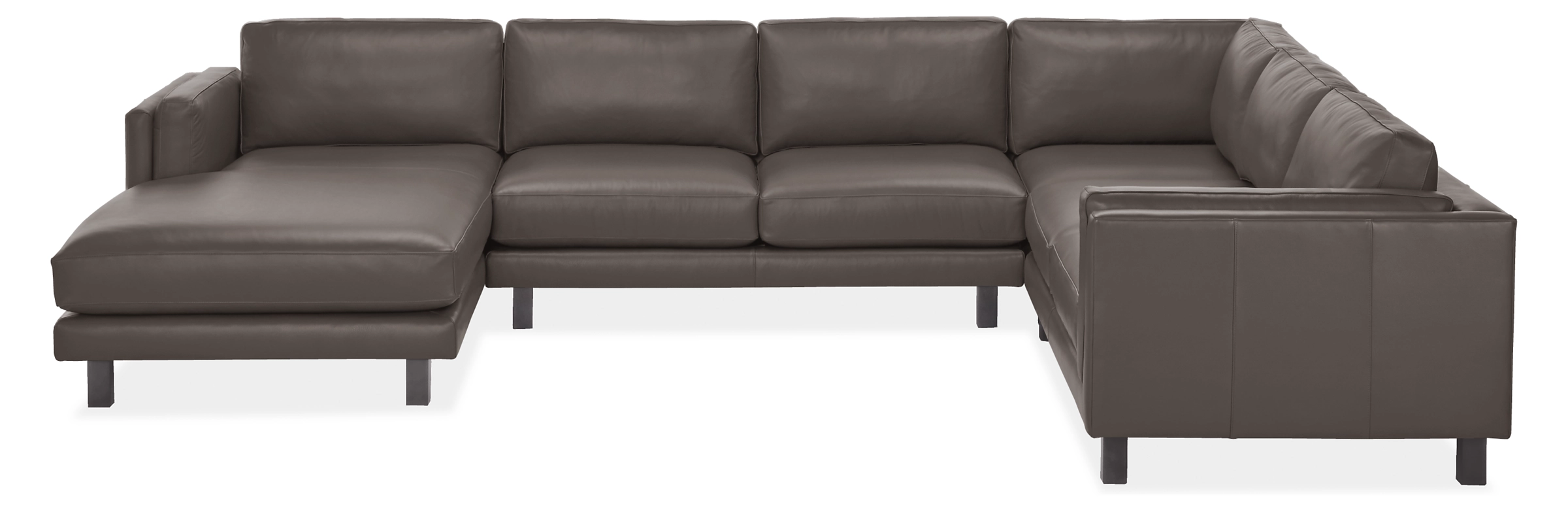 A modern design with classic details, the Cade leather sectional lets you lounge with a refined look. A deep seat invites relaxation, while tall square legs give this sectional a light presence. Attached arm cushions stay neat while adding an additional layer of comfort.