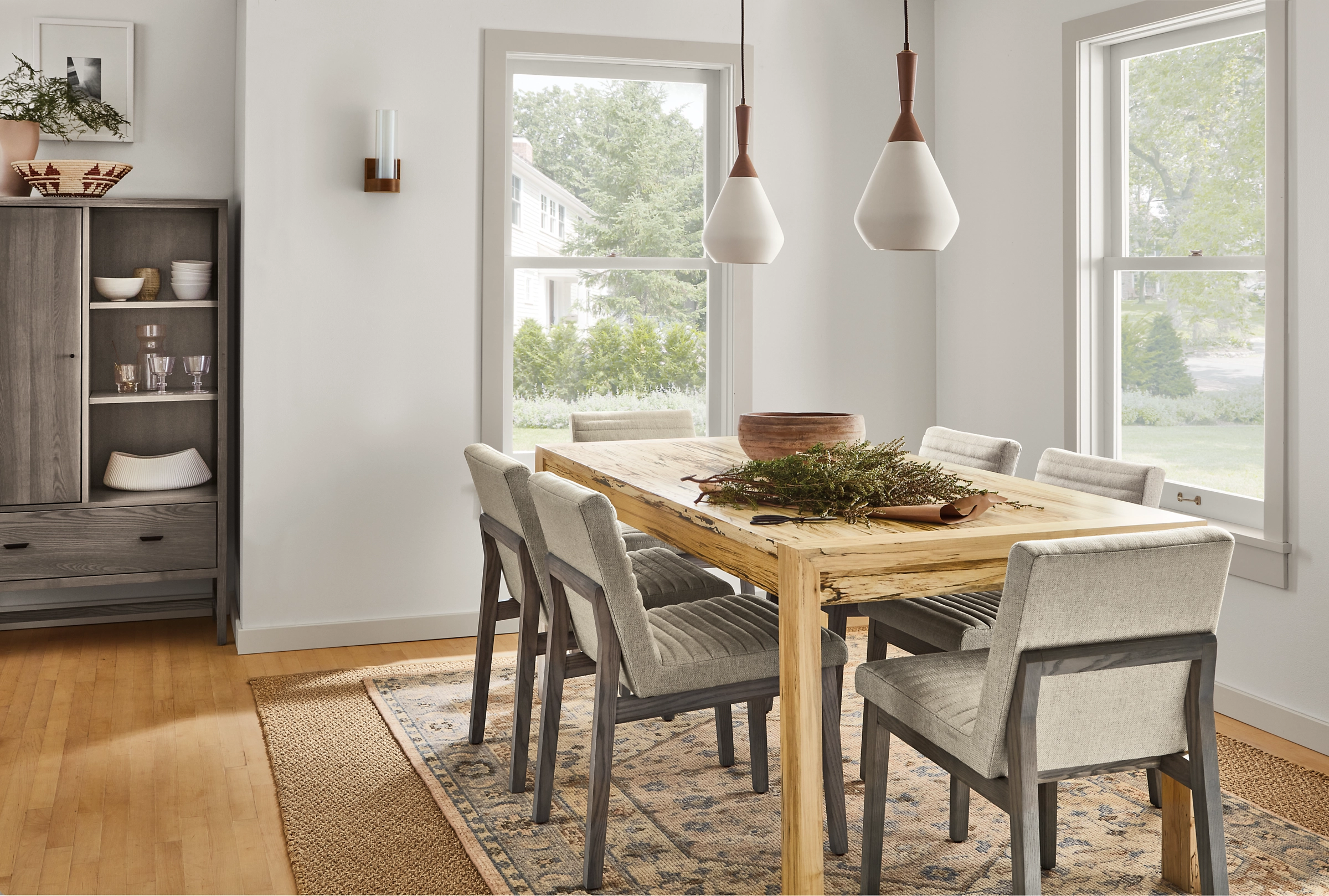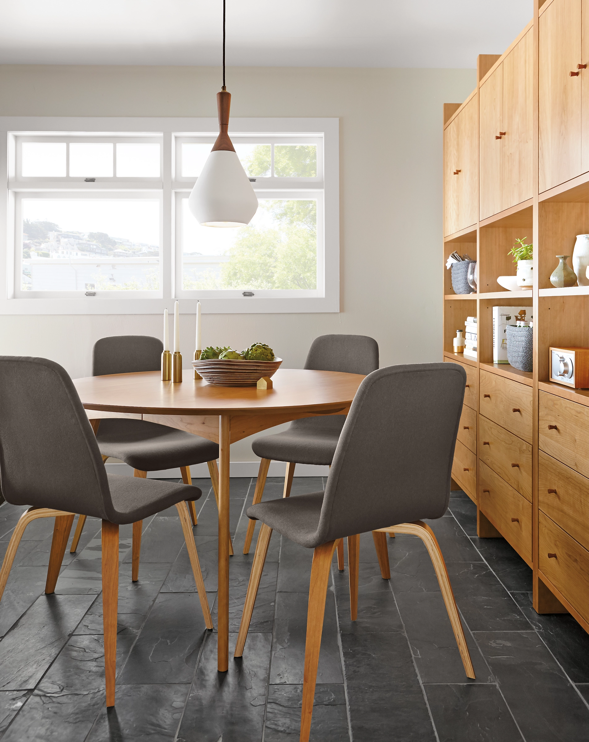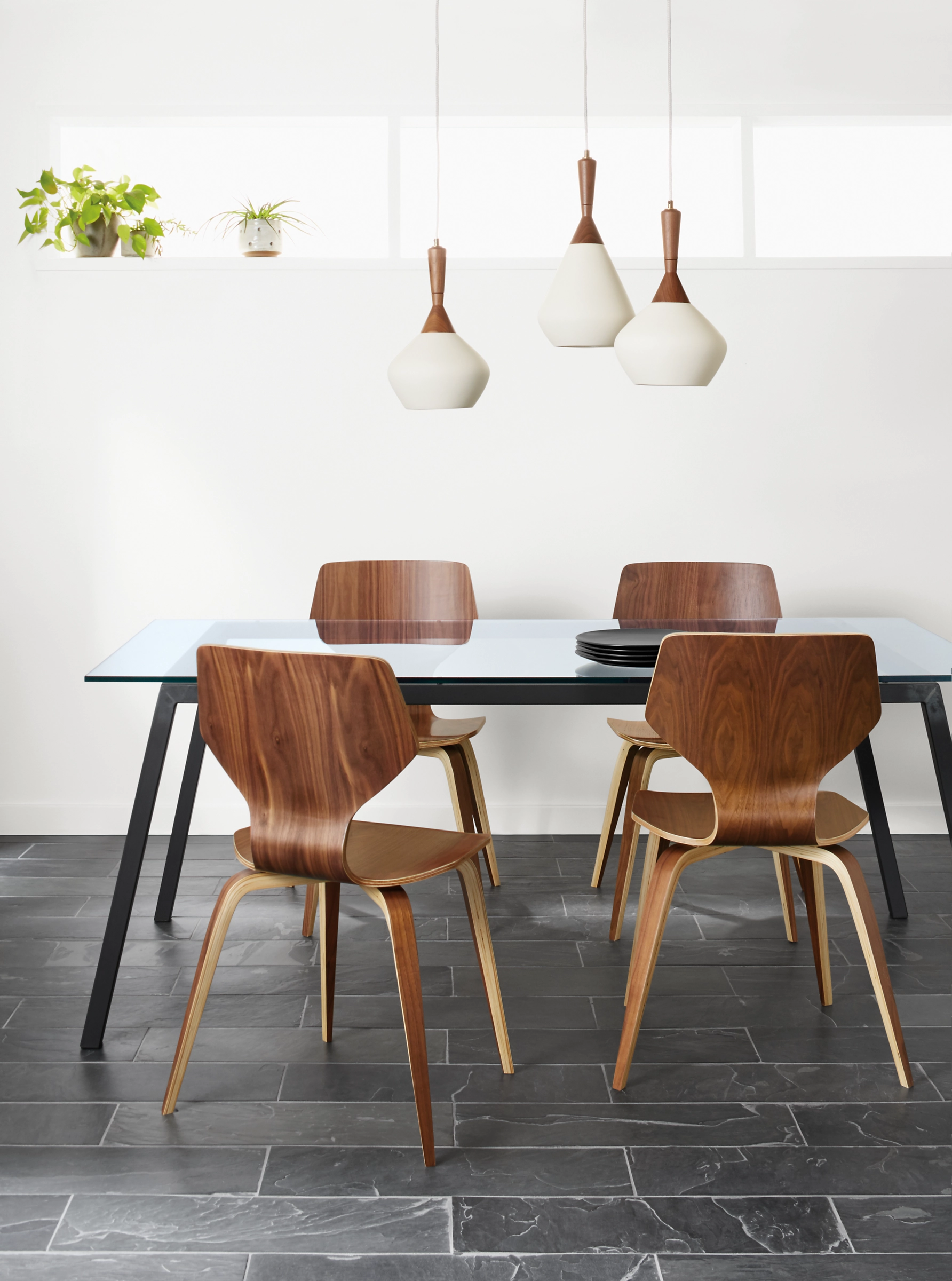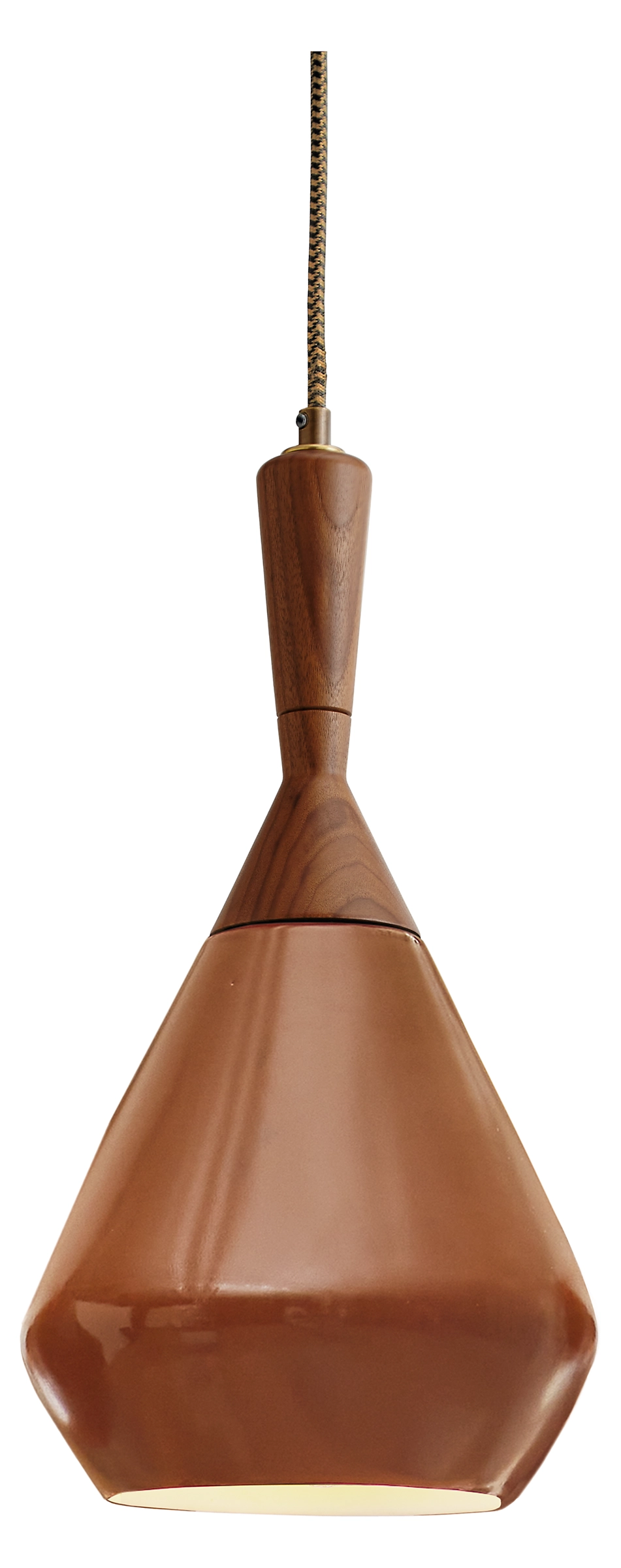 Handmade exclusively for Room & Board in the New York studio of KleinReid, the Cloak pendant lamp collection features a porcelain shade with walnut and aged-brass details. A braided cord creates an eye-catching design detail.
