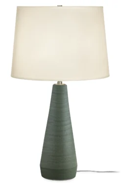The Donovan table lamp is handcrafted in Vermont, where artisans pour ceramic clay into a mold, then trim and finish each piece. After they carefully brush on a proprietary glaze in a specific order and thickness, the stoneware firing process reveals the lamp’s natural beauty. Donovan’s minimalist modern design and quality mix of materials lend a subtle elegance to any space, while the three-way LED bulb provides warm soft light through the cotton shade.