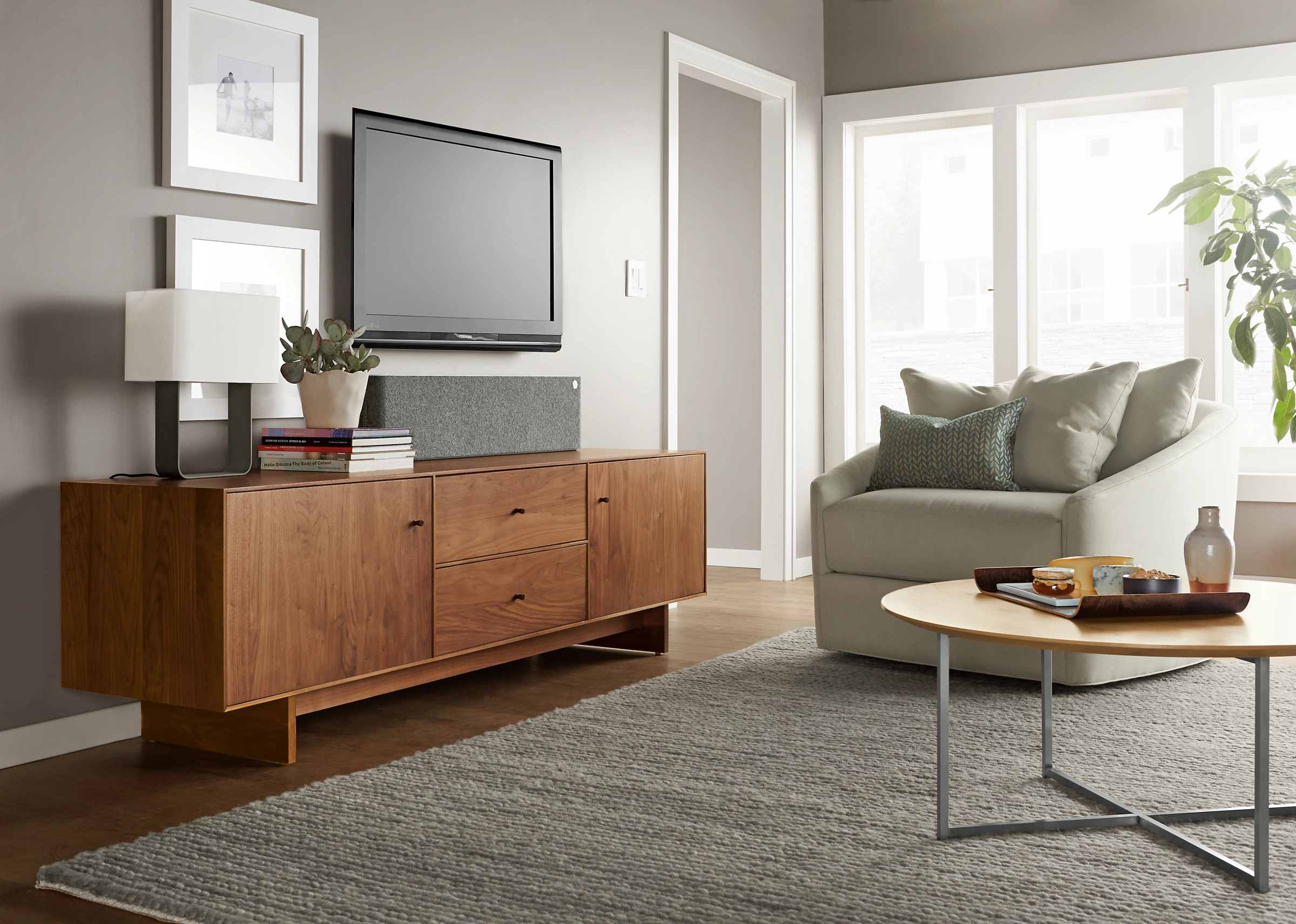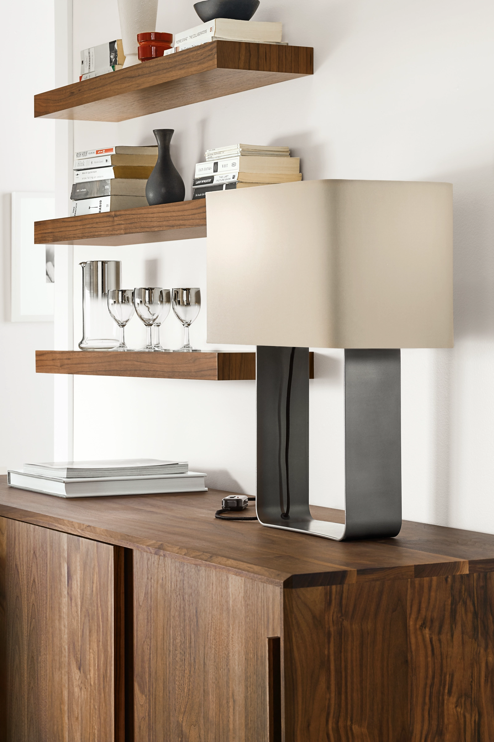 We designed this modern table lamp with a distinctively curved hand-welded base topped with a linen shade. Made in Wisconsin from quality U.S. and imported materials, this versatile lamp features a dimmer to provide a full range of illumination.