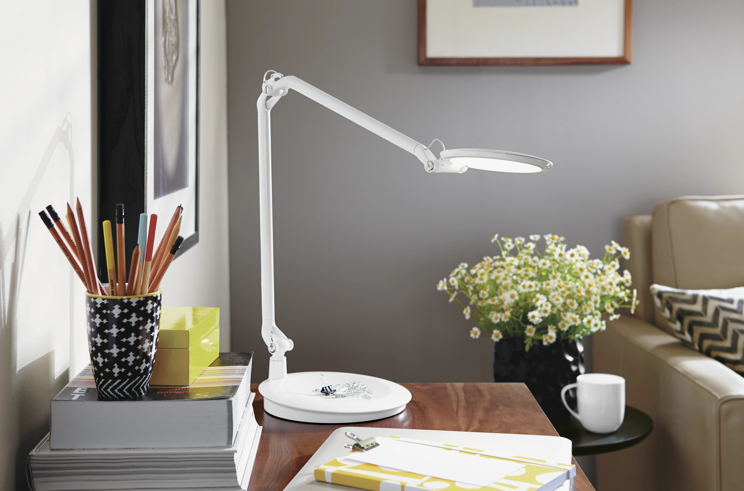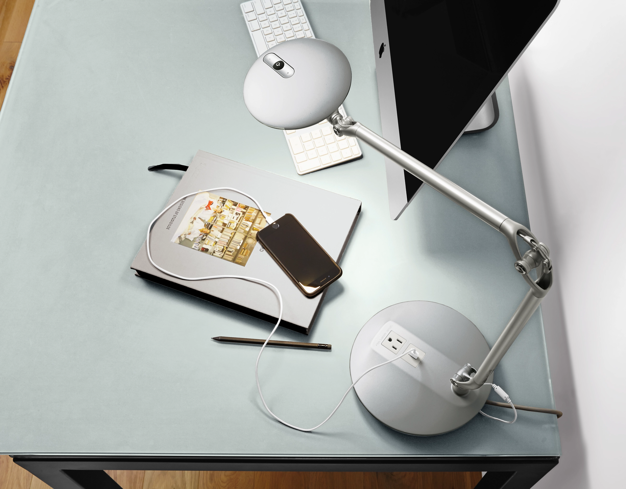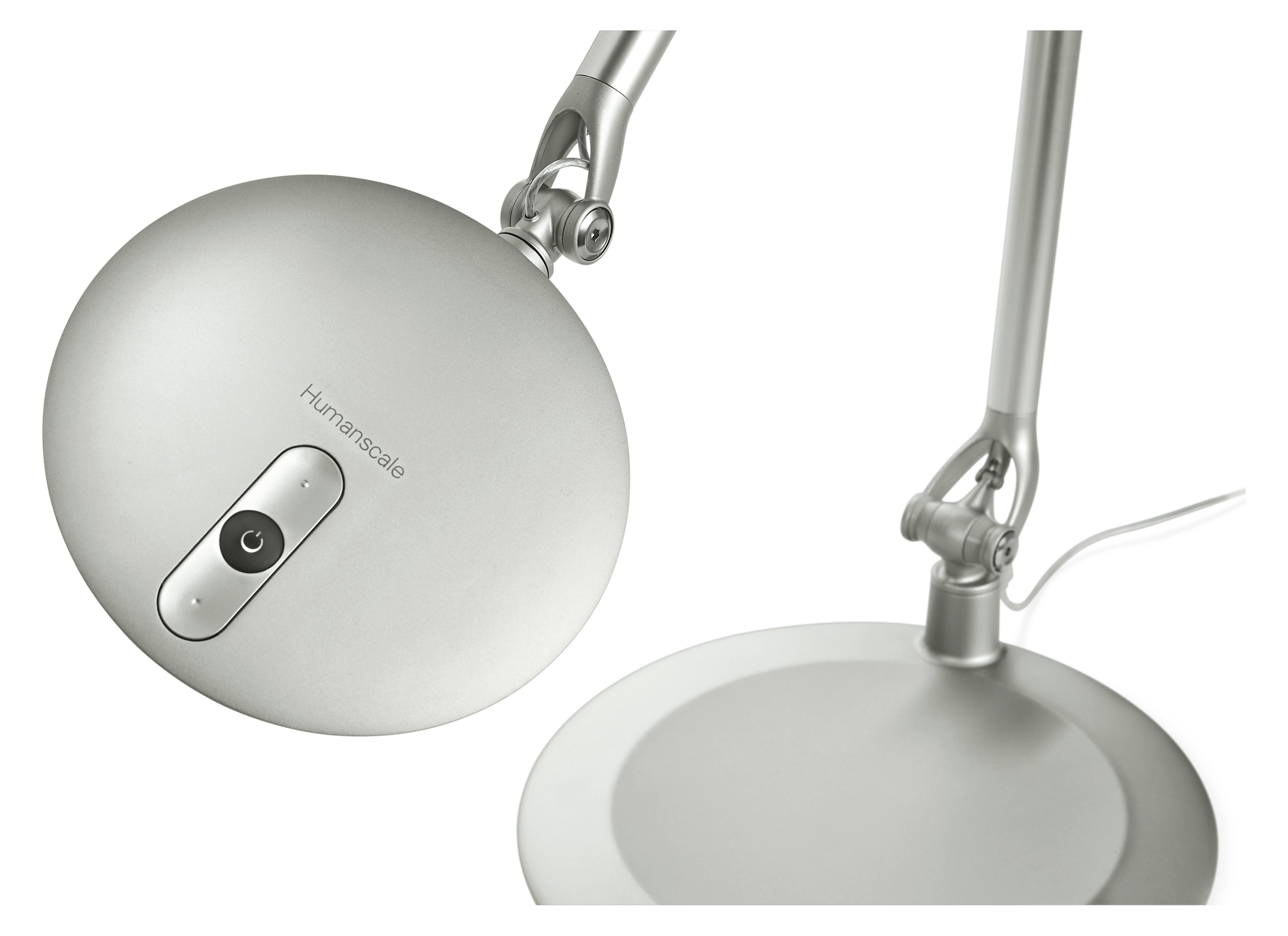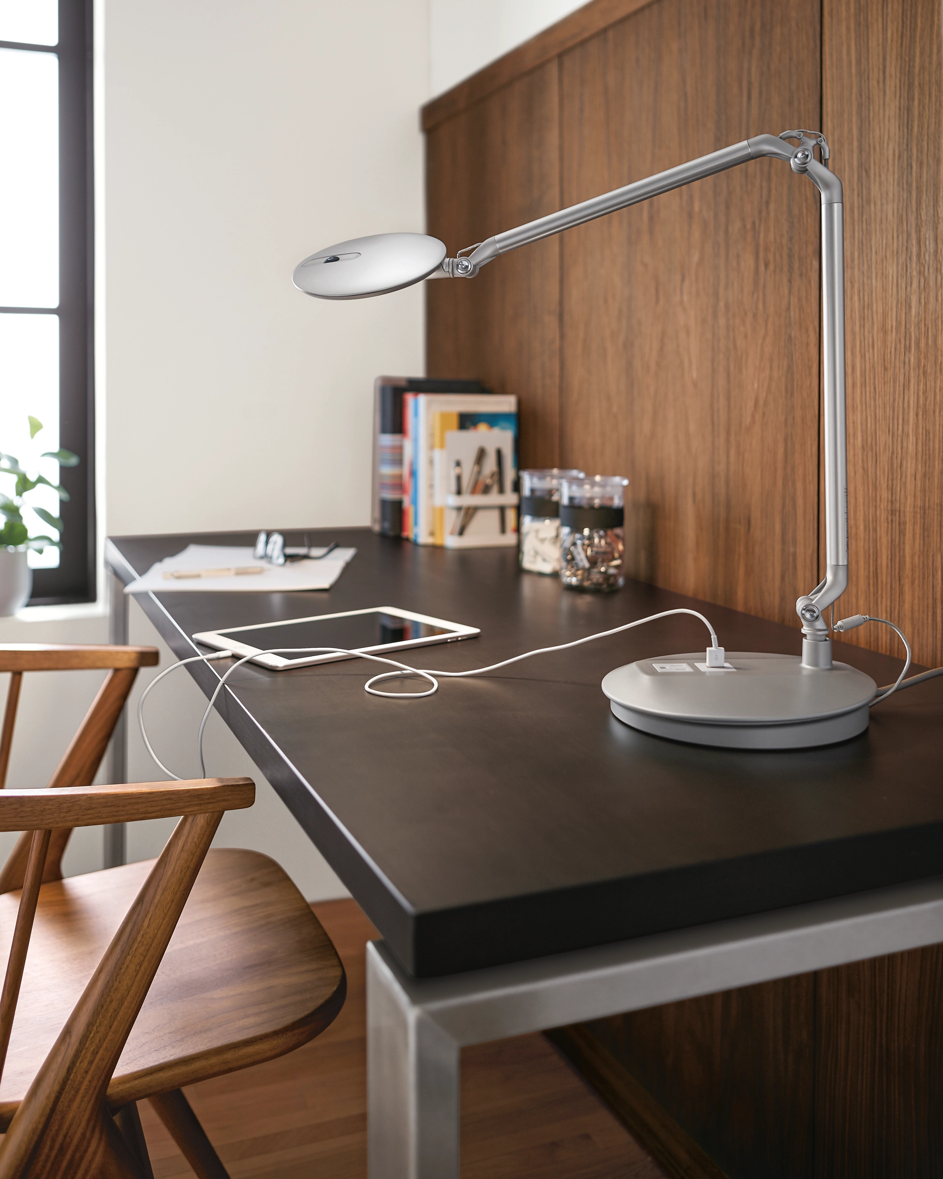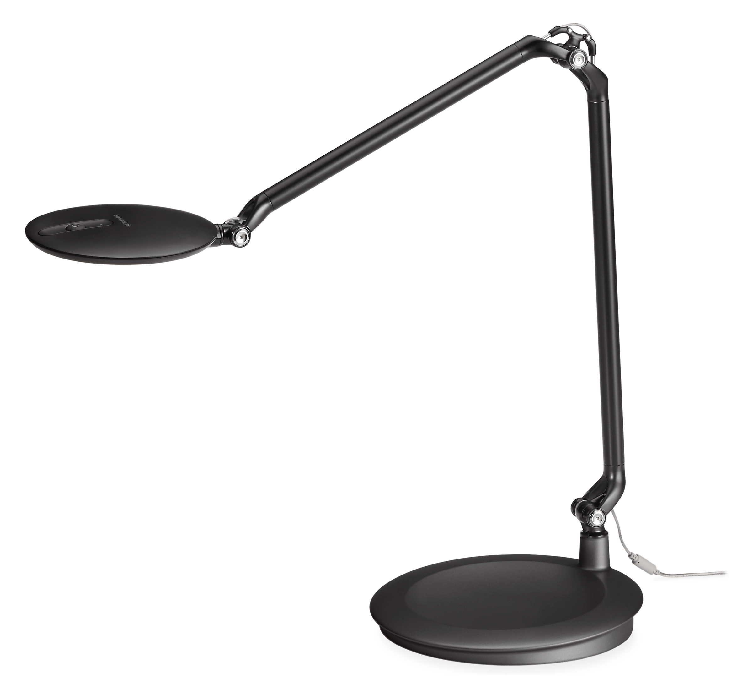 The Element Disc™ by Humanscale® uses innovative Thin Film LED Technology™, offering seven levels of brightness – from nightlight level to bright reading light—with just a pinch of the light head. It also features a sensor that turns the lamp on or off when someone enters or leaves the area. The optional power base includes a grounded power outlet and a USB 2.0 port. When you’re not using the Element Disc™, you can fold the lamp head onto the base to save space. Now that’s smart lighting.
