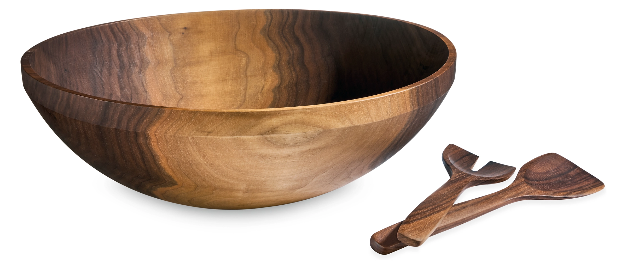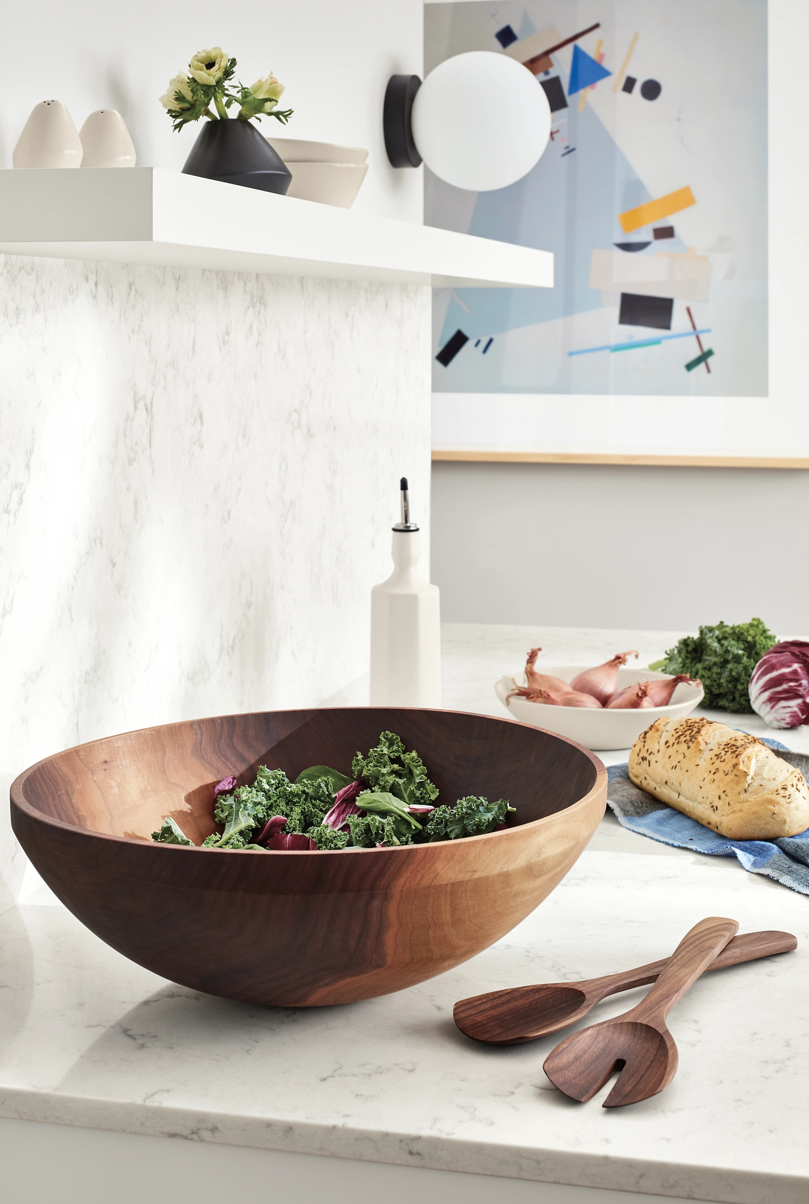 Created in partnership with Live Edge Detroit and Holland Bowl Mill, our Elliott wood bowl and Moore servers are made from reclaimed urban wood. Each bowl is finished with beeswax and mineral oil. This salad set is lovely for your table or makes an excellent gift.