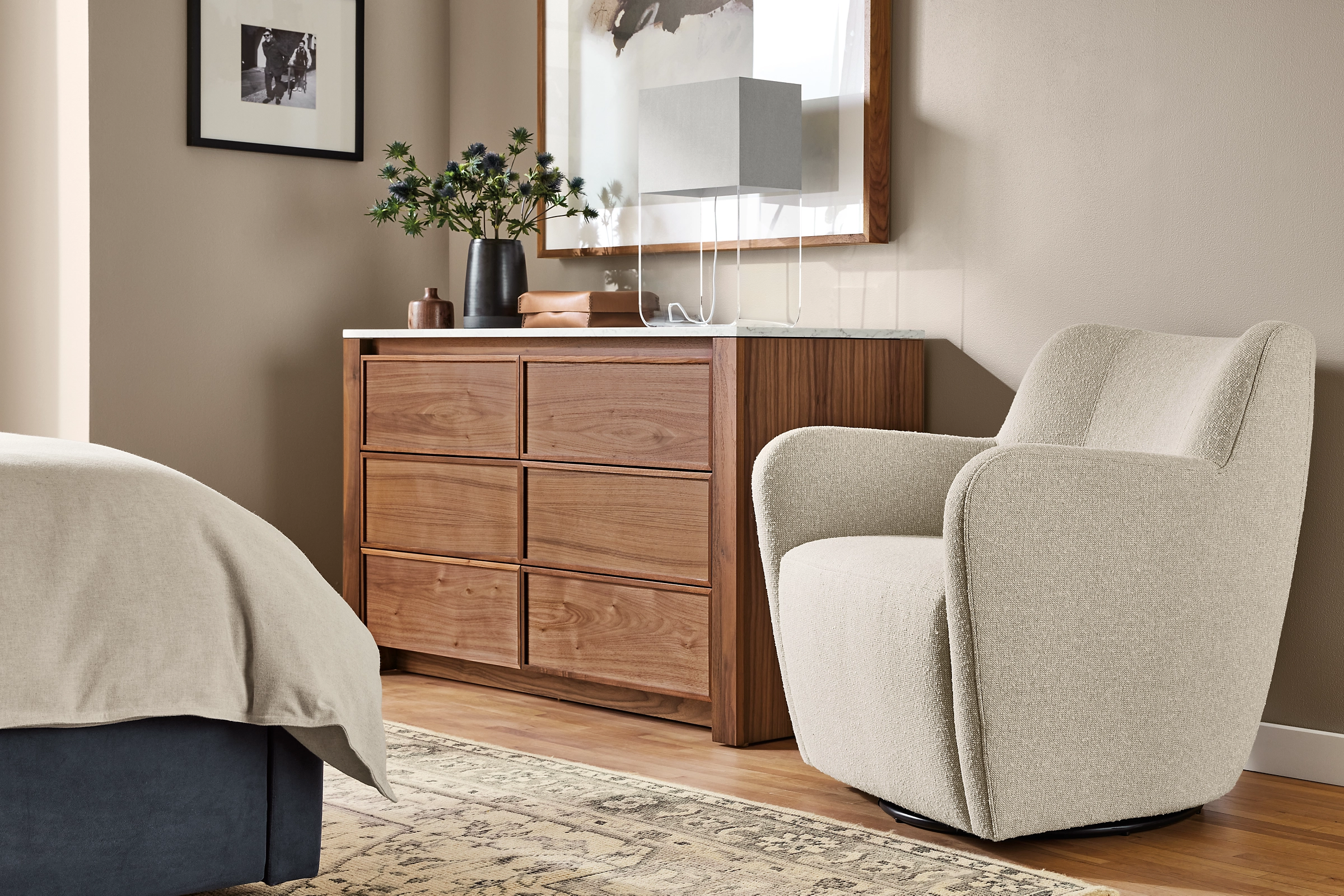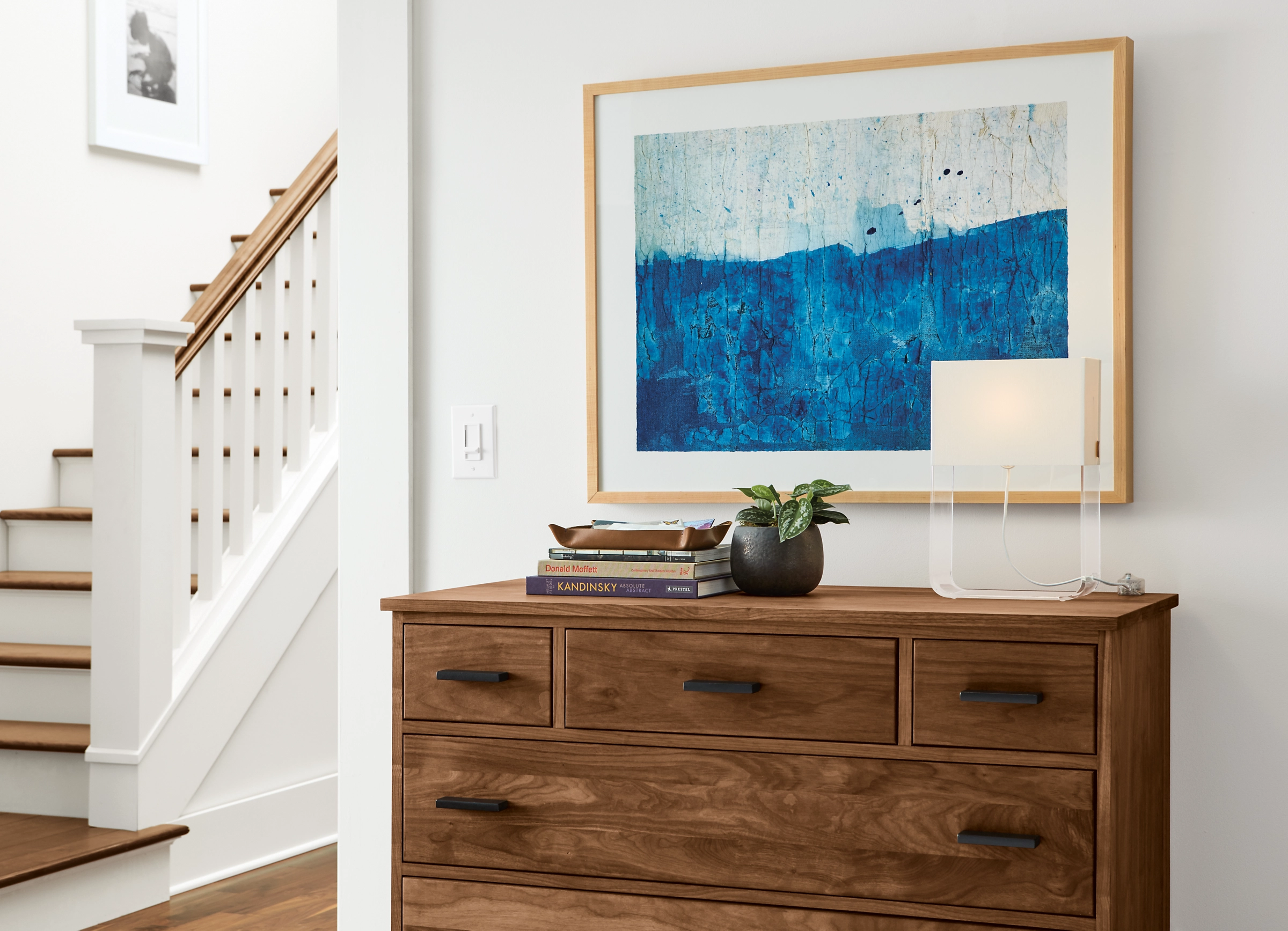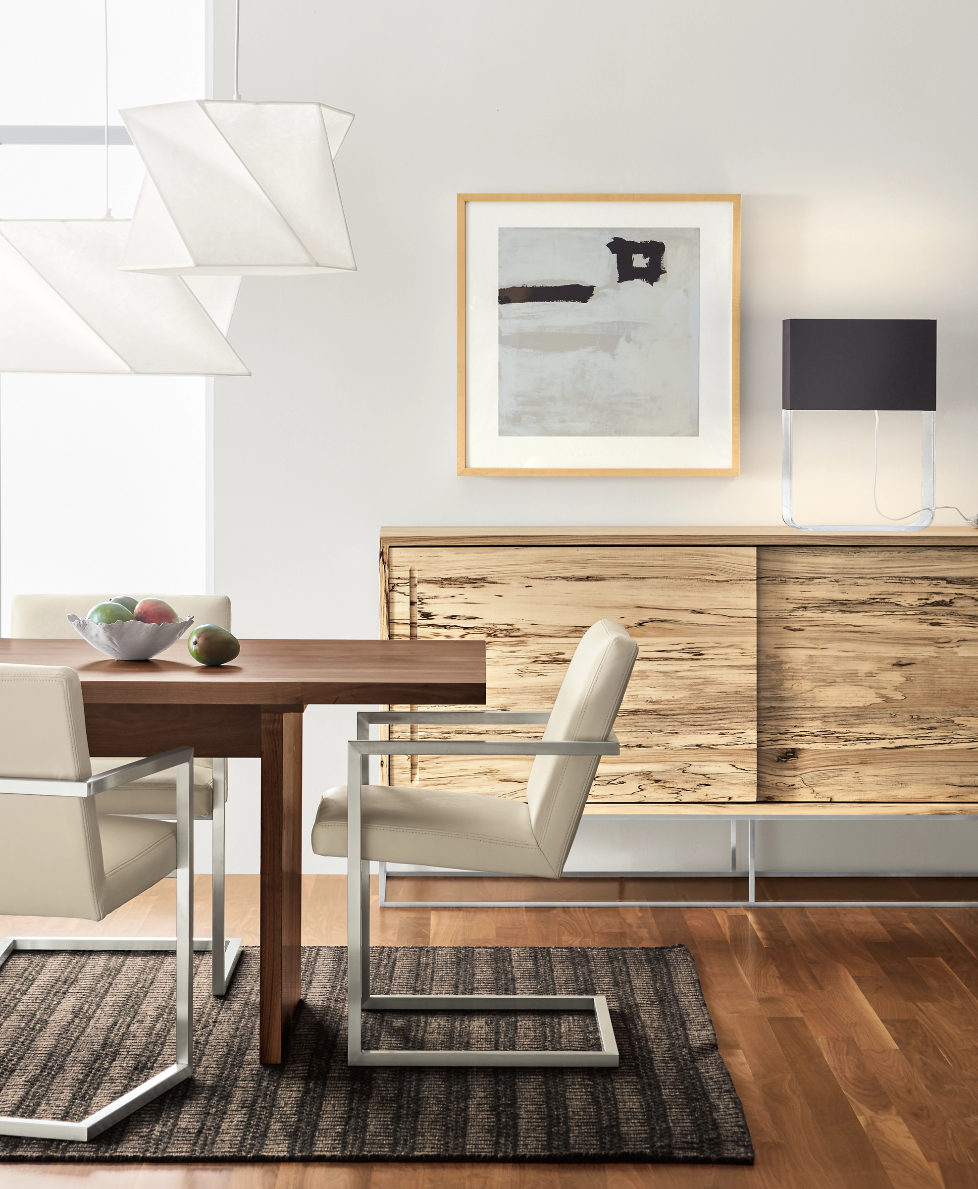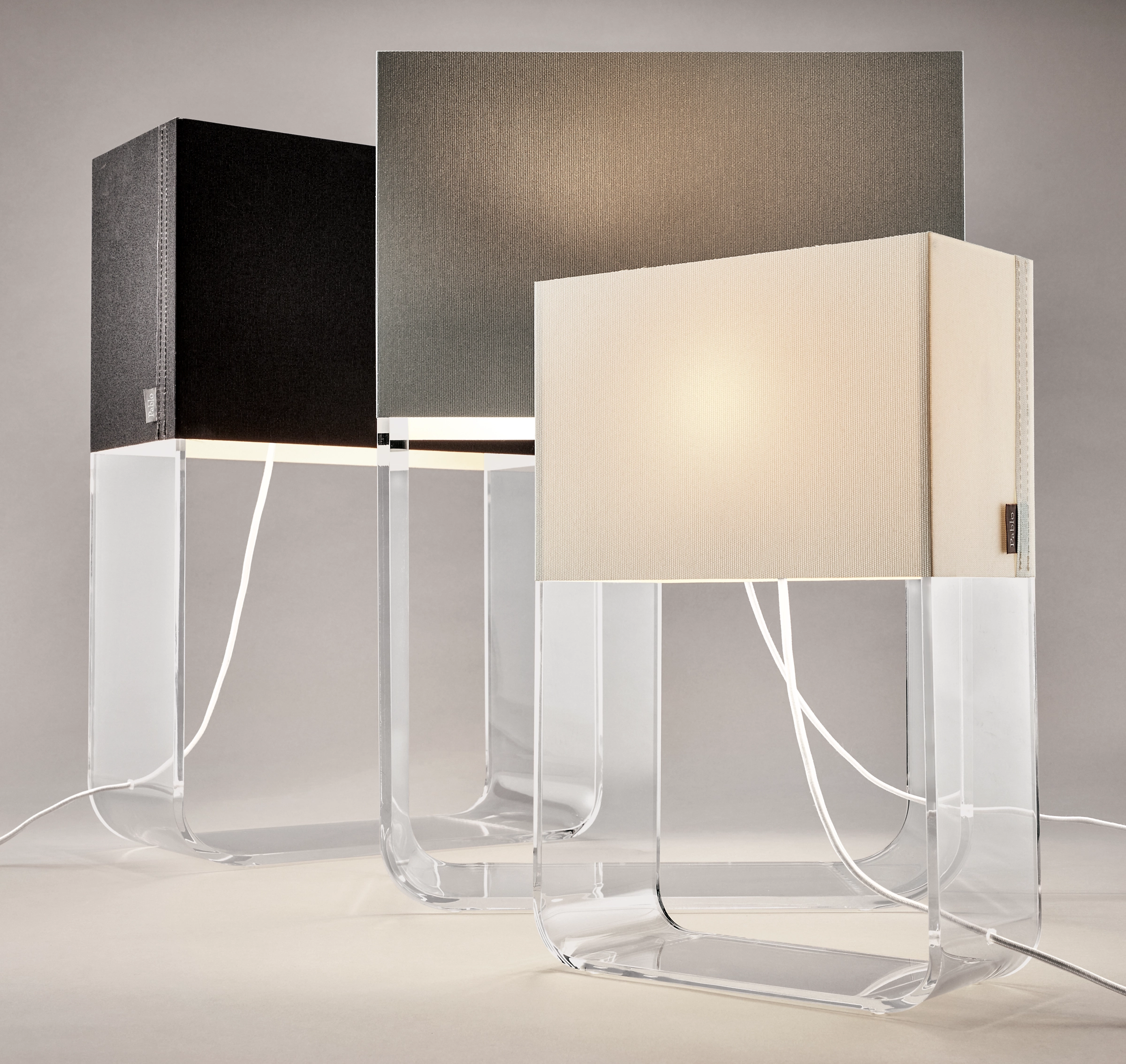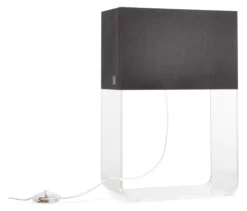 Designed for Room & Board by Peter Stathis of Pablo Lighting, the unique mesh fabric shade stretches between the U-shaped base arms. The clear acrylic base gives the illusion of floating on the table on which it’s placed. This lamp has a dimmer switch on the cord for versatility.