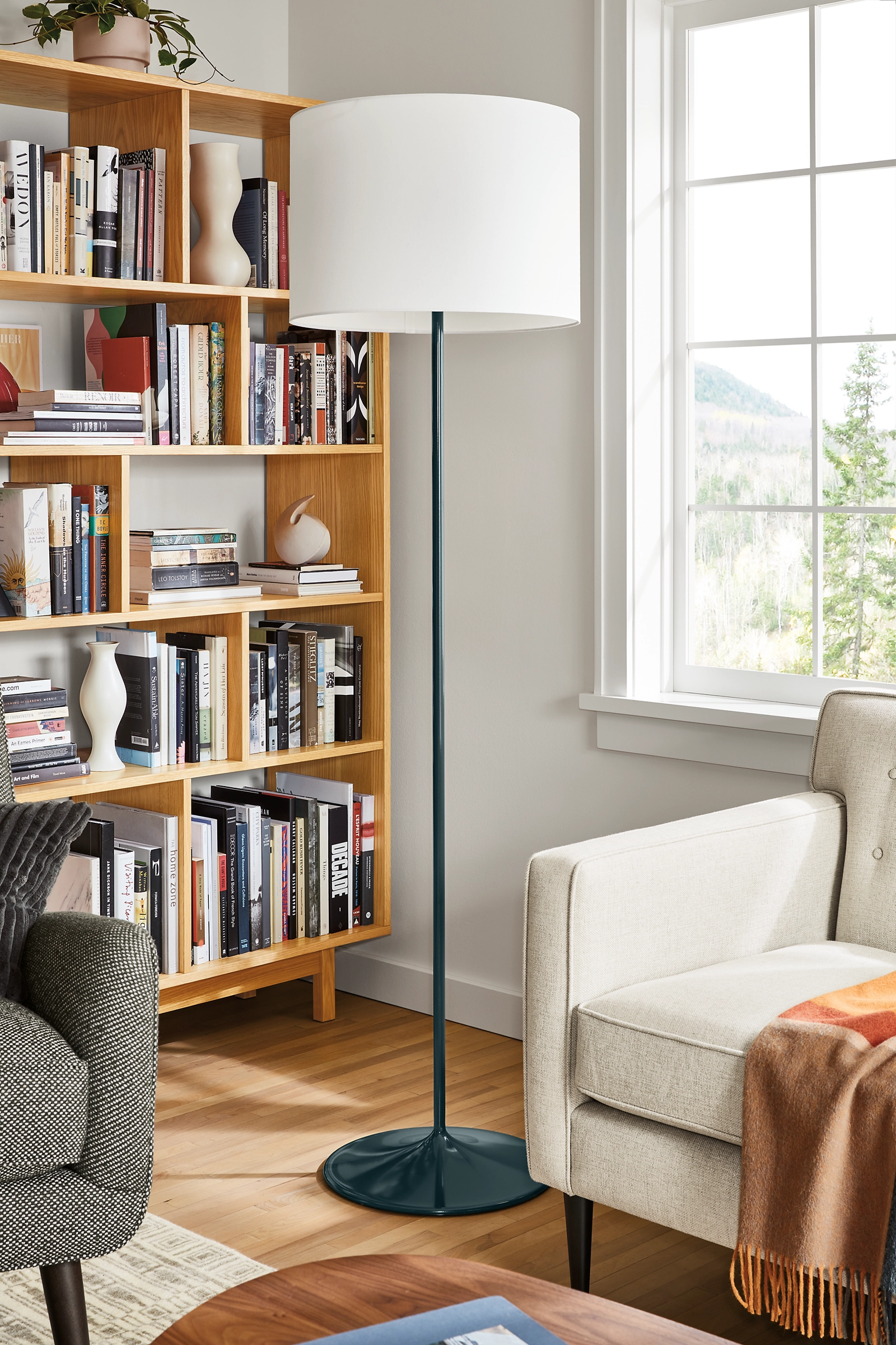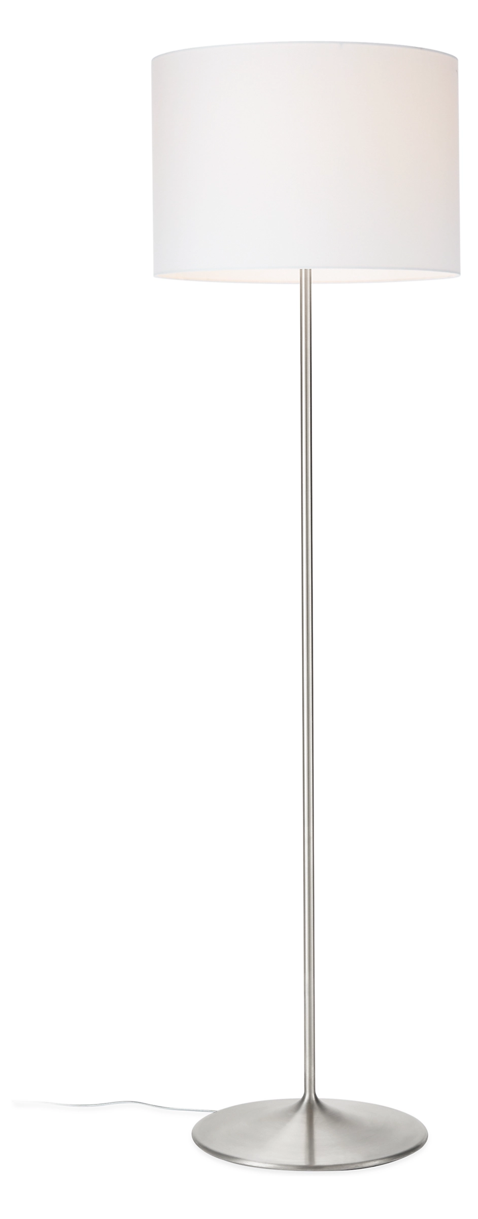 Our Fremont floor lamp has a fluid shape and a sleek, modern design. We designed the spun steel base to provide stability while reinforcing the minimal look of the lamp. A white fabric shade allows a diffuse glow and a full-range dimmer adds versatility.