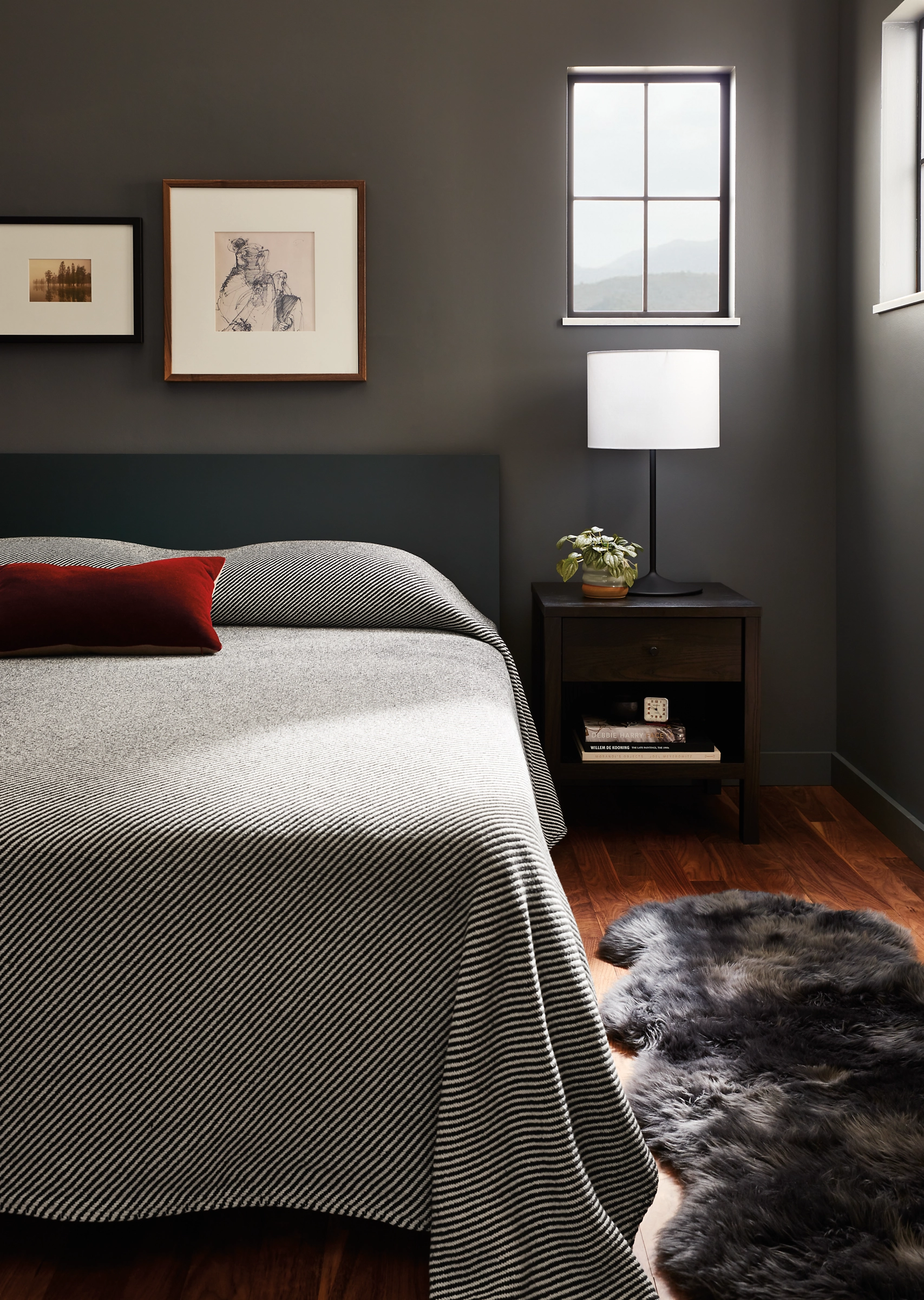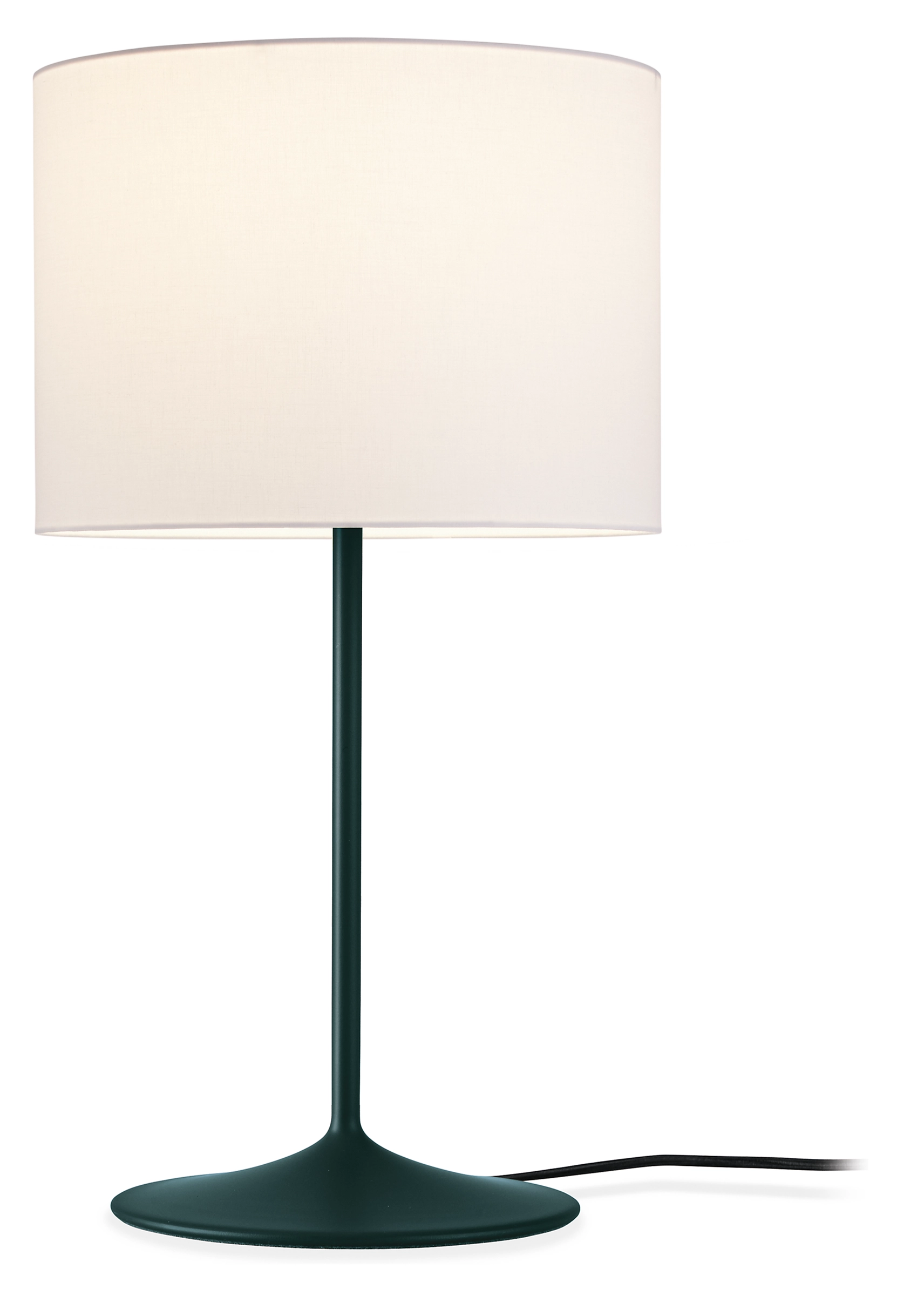 Our Fremont table lamp has a fluid shape and a sleek, modern design. We designed the spun steel base to provide stability while reinforcing the minimal look of the lamp. A white fabric shade provides a diffused warm glow and a full-range dimmer adds versatility.