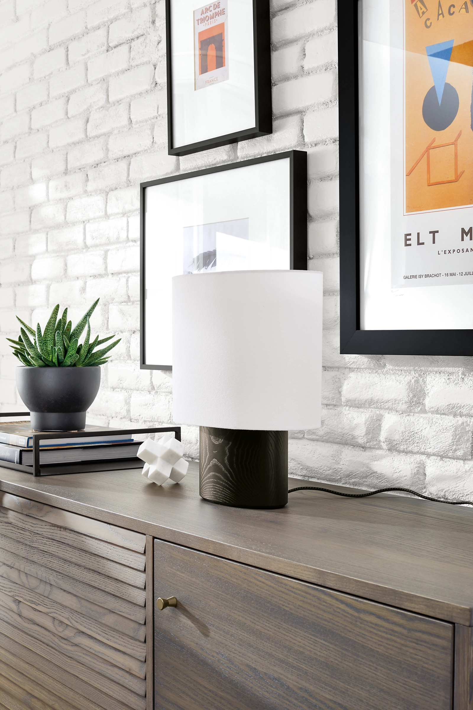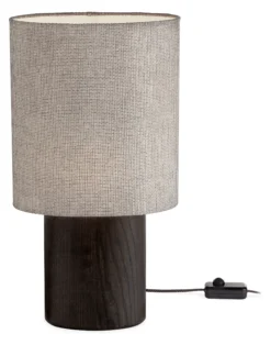 The unique, elliptical shape of this lamp makes it stand out. A solid wood base anchors the piece while the shade appears to float above it. This lamp has a small footprint, allowing it to be used in many spaces. Includes an LED bulb.