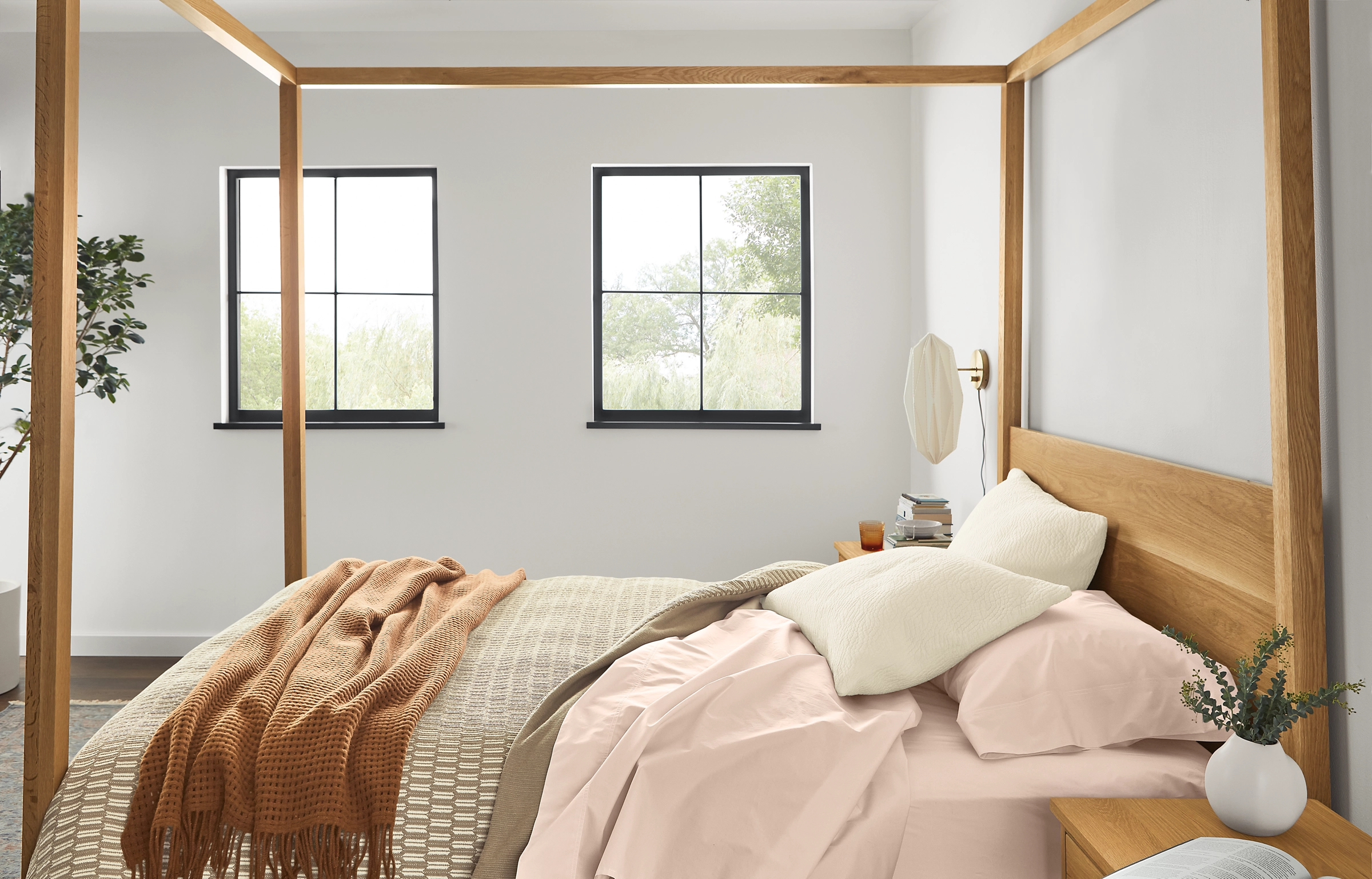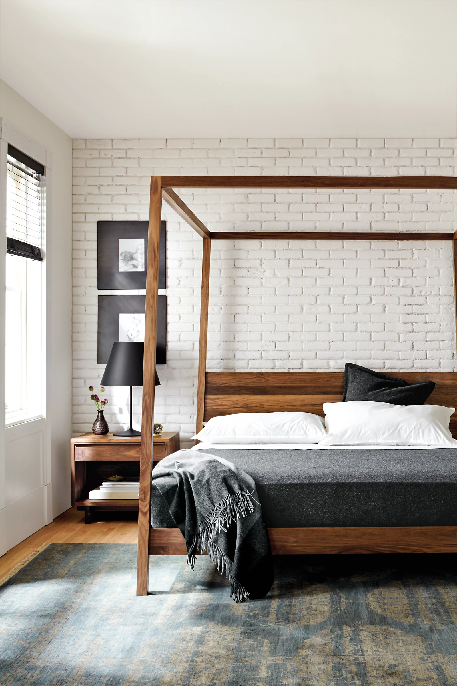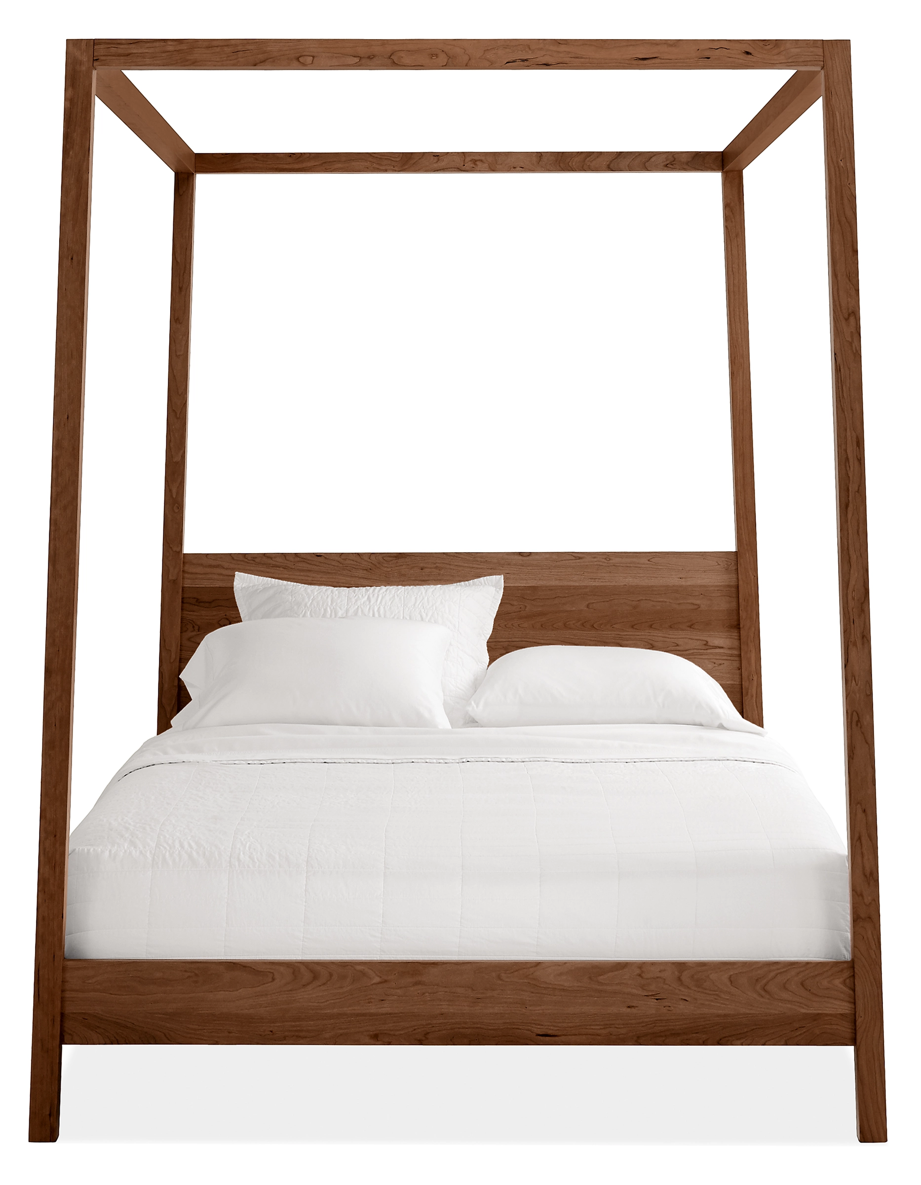 Our Hale bed is a modern canopy bed made from solid wood in West Virginia by skilled woodworkers. The dramatic canopy design and the gently angled posts highlight the intrinsic natural beauty of solid wood. Like all our modern beds, Hale doesn’t need a box spring, giving your bedroom a cleaner look.