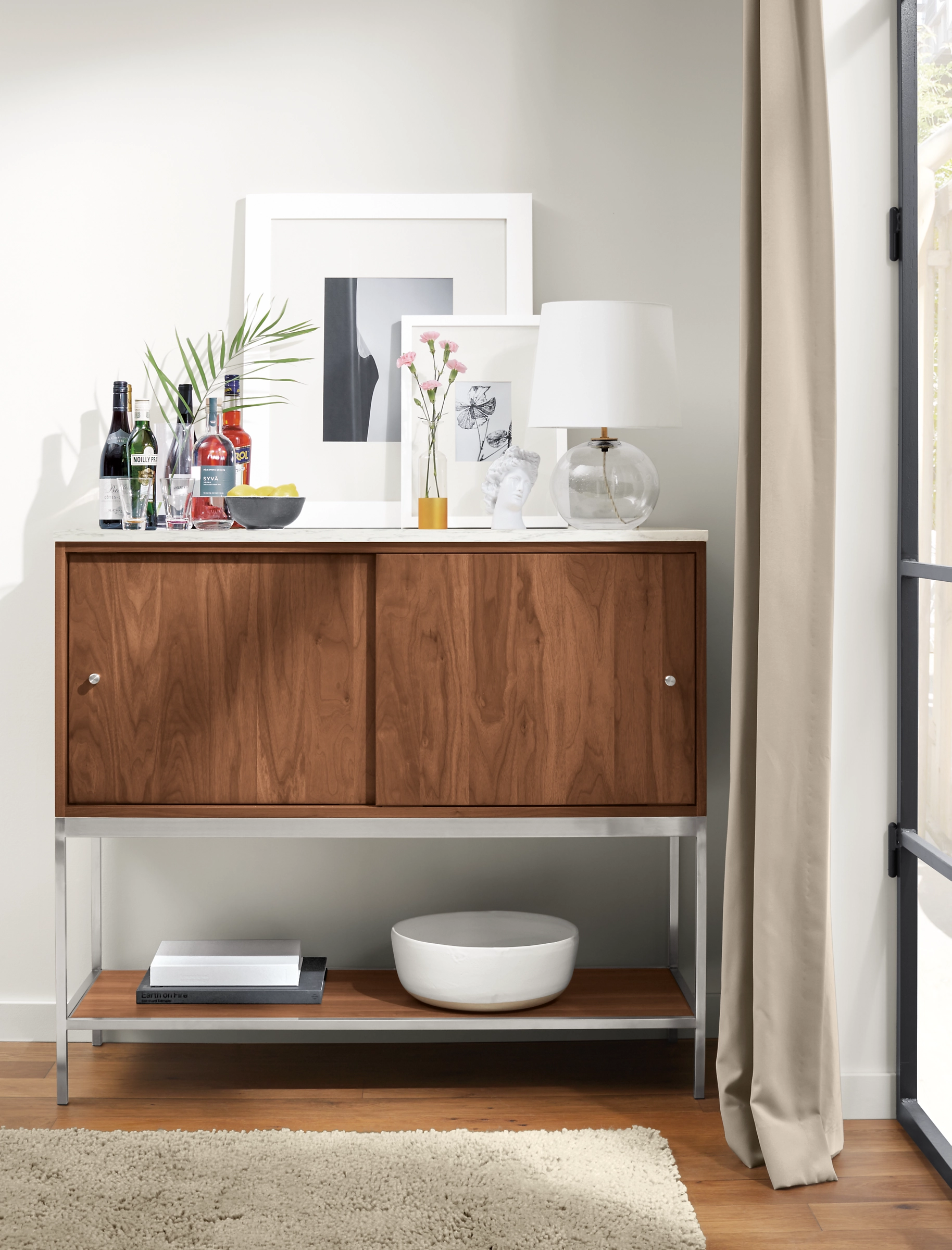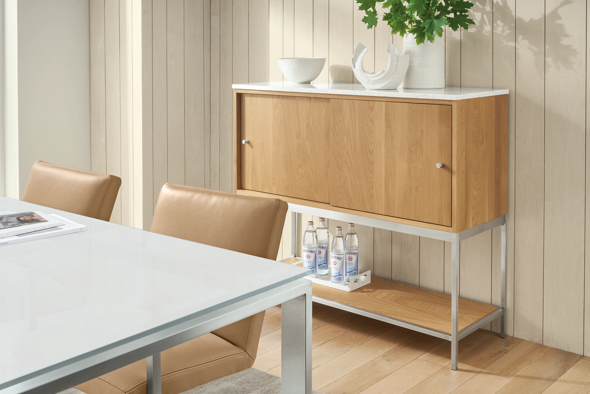 Ideal for entertaining, this bar cabinet has pull-out drawers, a durable stone top and plenty of storage. The top is at bar height so it’s easy to mix drinks. The Linear collection combines craftsmanship, functionality and timeless design, which has made it a Room & Board cornerstone since 1990.