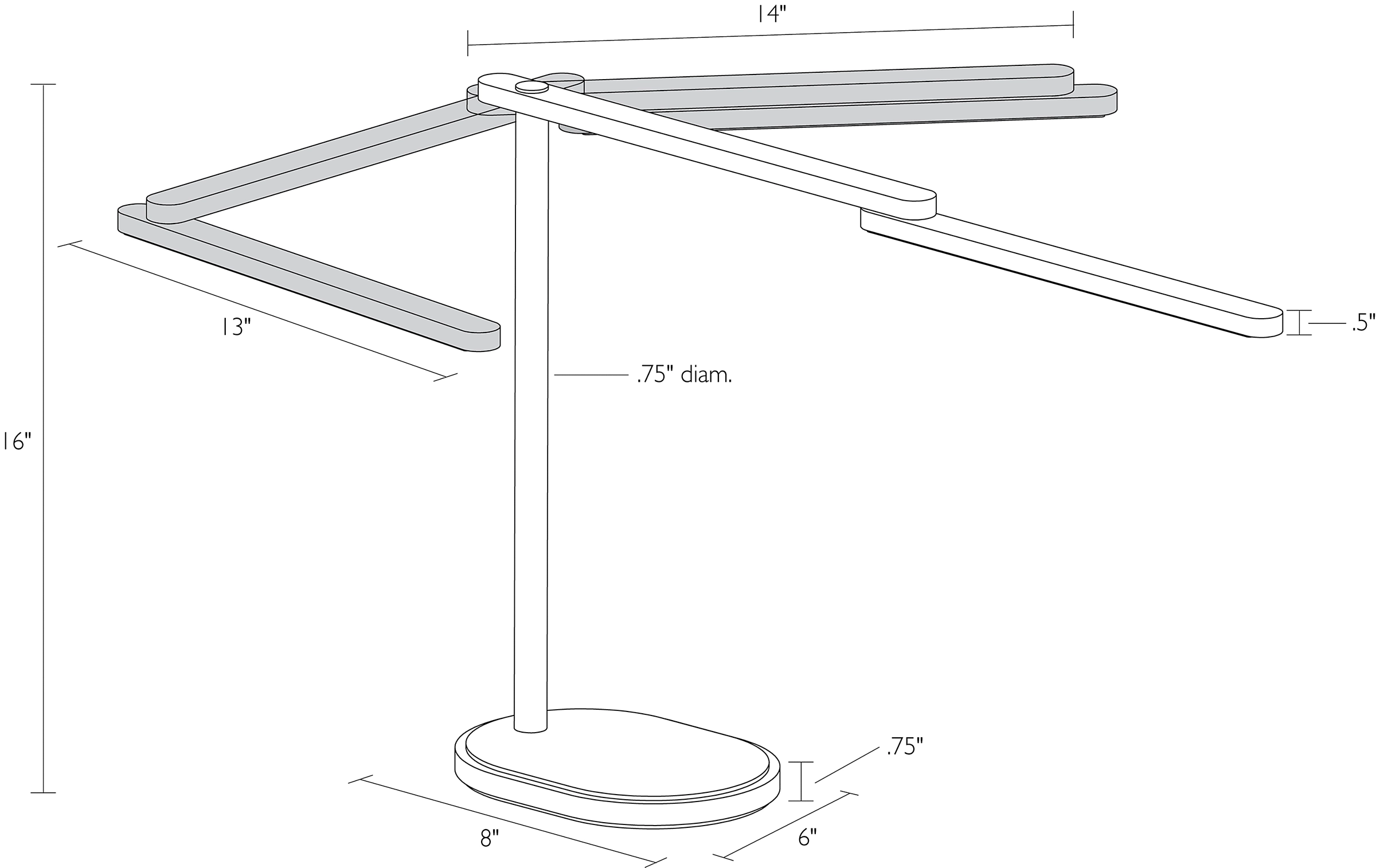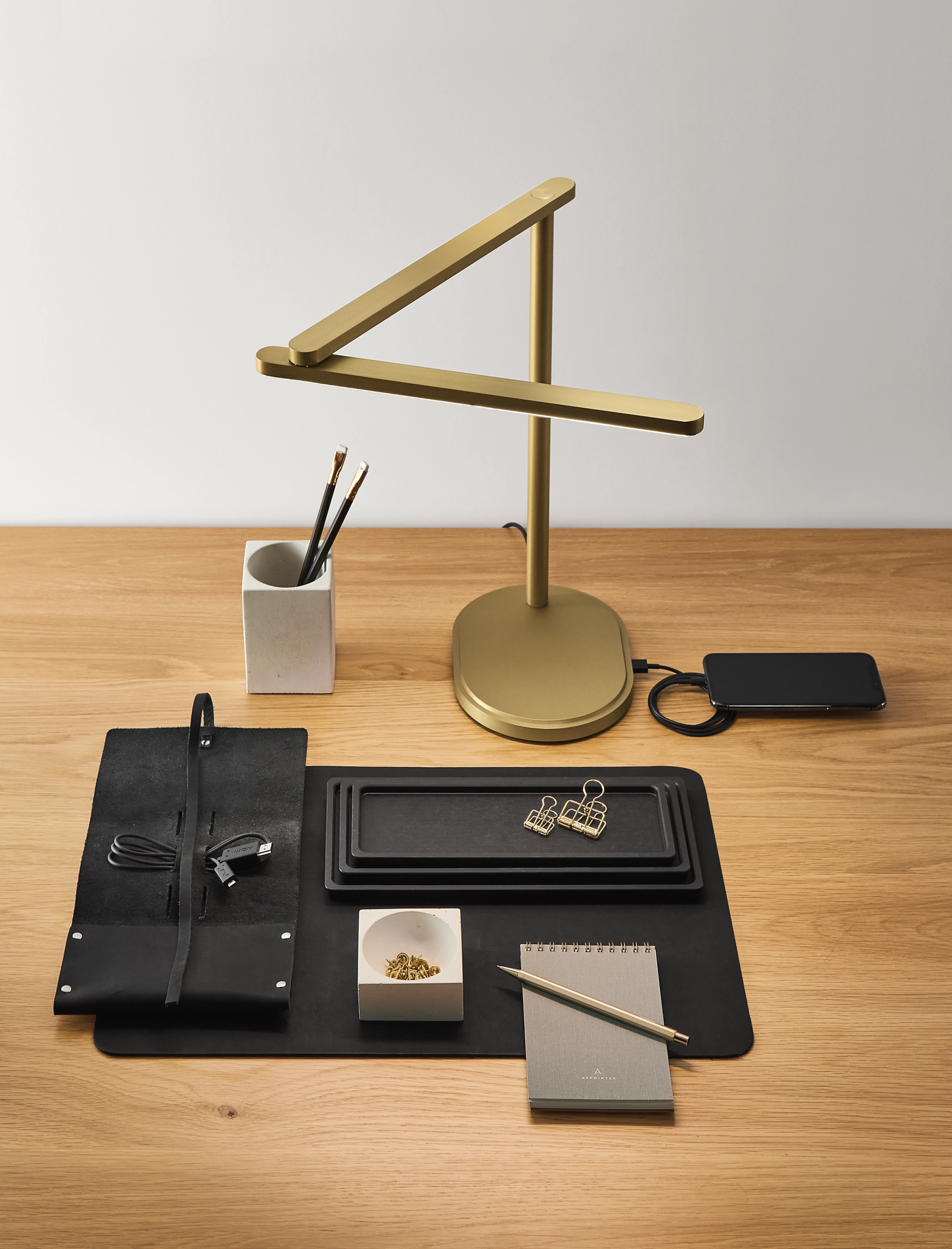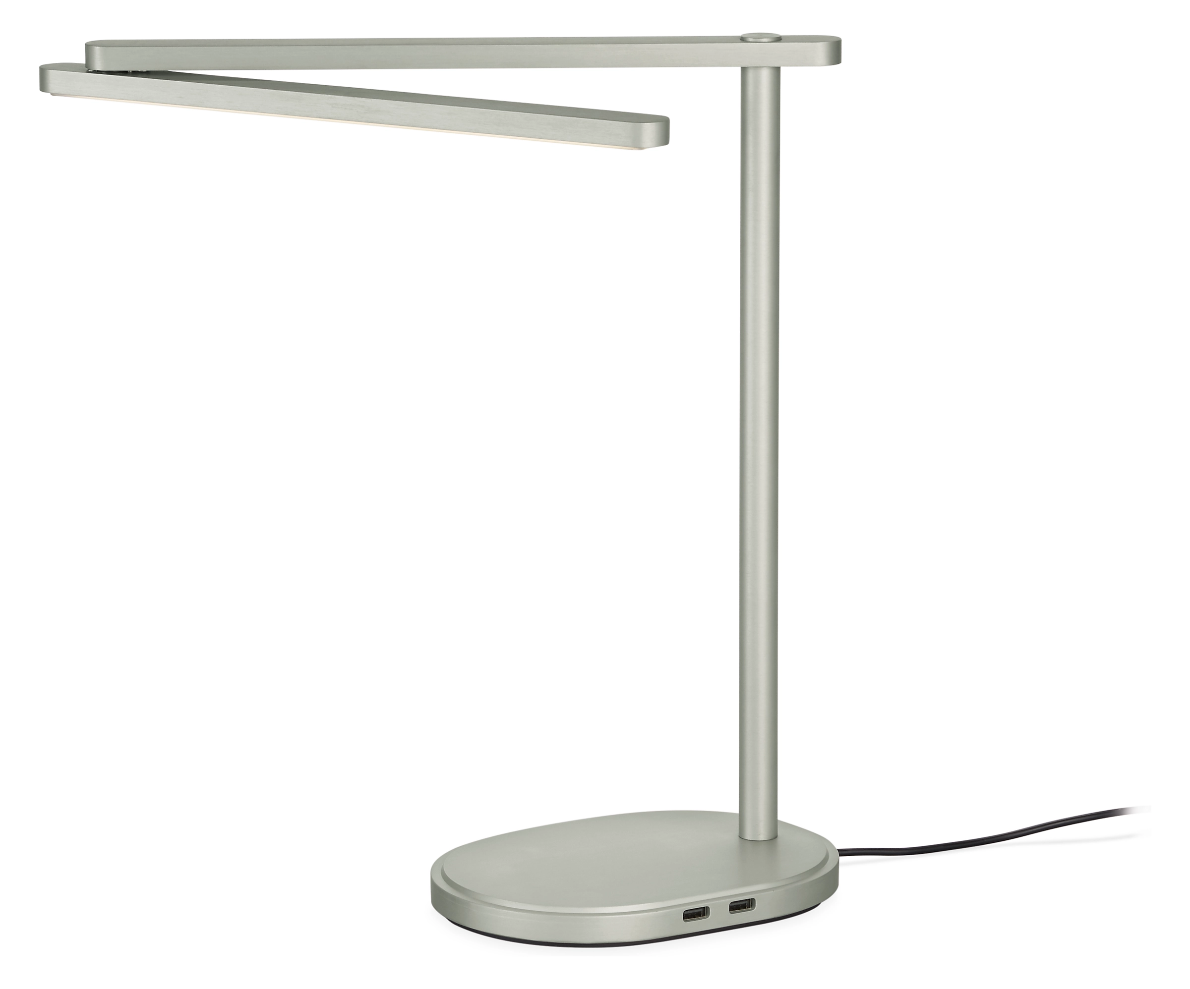 Sleek and sophisticated, the Pivot task lamp offers targeted illumination in an anodized aluminum body. Pivot’s unique two-arm design makes it easy to direct light anywhere on your work surface. The acrylic diffuser provides a soft glow from the side, while the dimmable LED board delivers crisp bright light. Plus, two USB ports in the base make for easy device-charging.