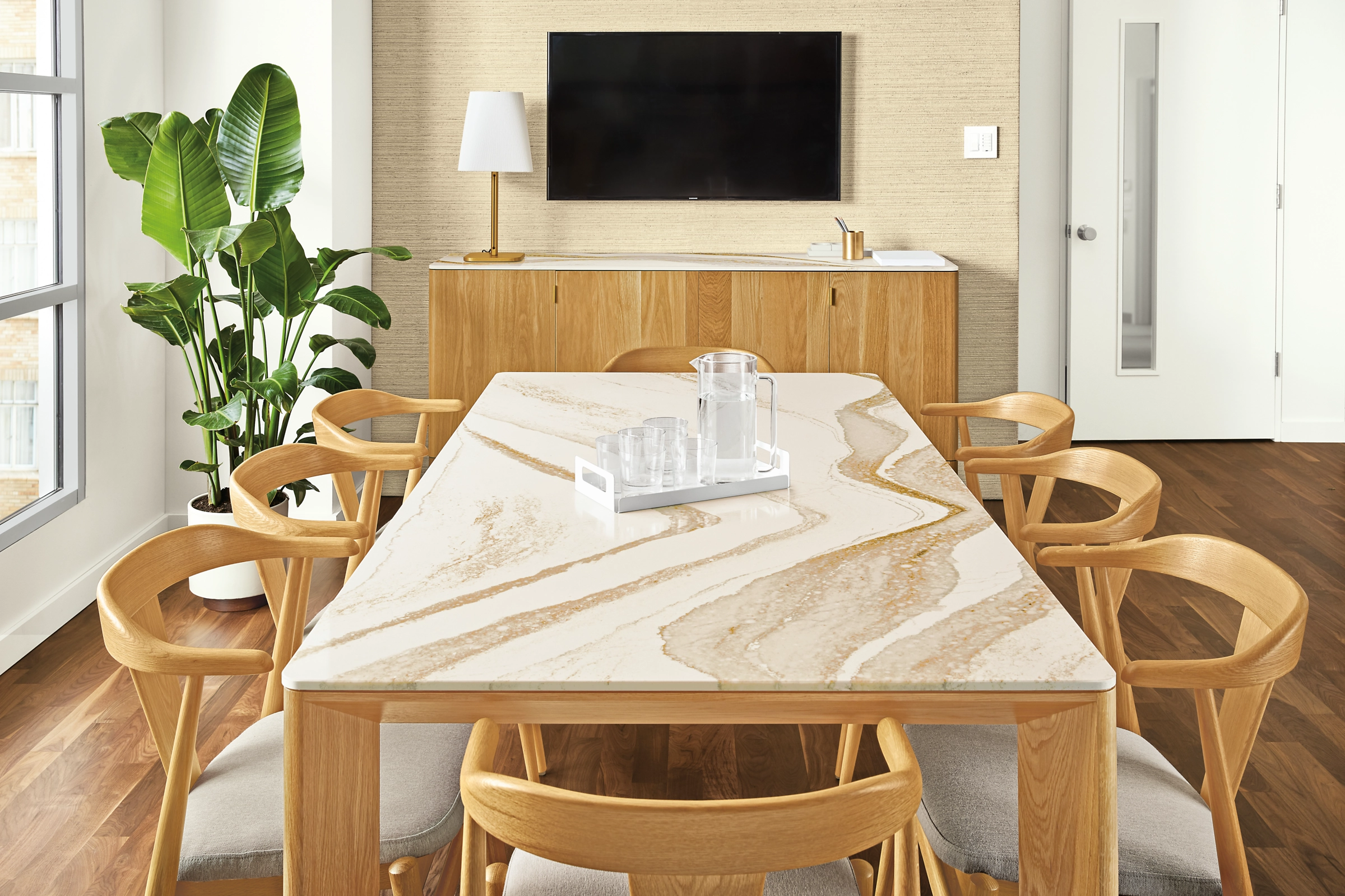 Designed by Room & Board and created in collaboration with Cambria, the Pren conference table tells a story of American craftsmanship. West Virginia artisans shape U.S.-sourced solid wood into soft curves and beveled edges designed to draw your eye to the beauty of a Cambria quartz top. Pren offers eye-catching modern design with the easy care and durability of Cambria surfaces.