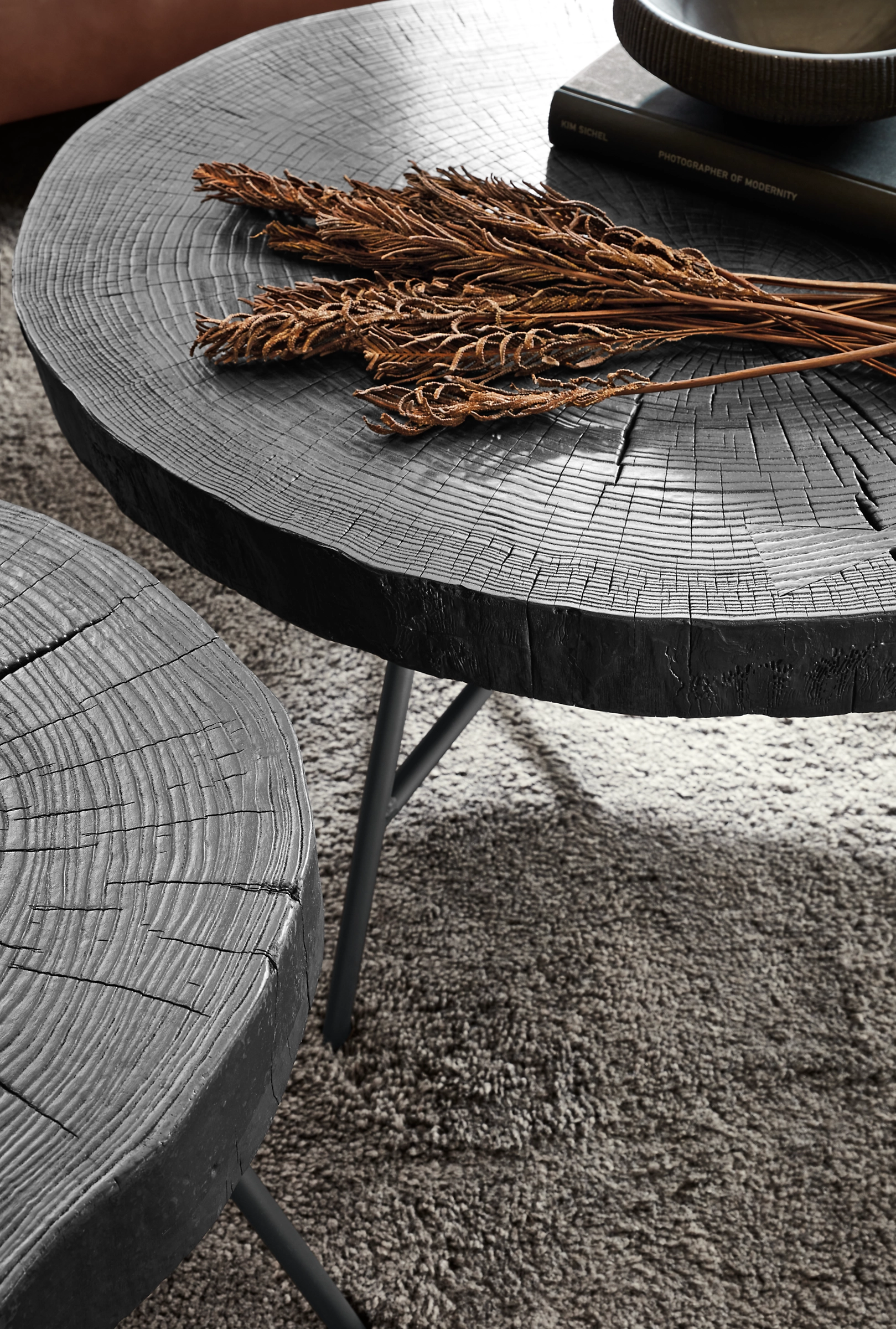 Harvested from trees removed by the city of Minneapolis in response to an emerald ash borer infestation, these coffee tables have been treated with the traditional Japanese technique of shou-sugi-ban where they are flame charred prior to sealing for a rich black color.