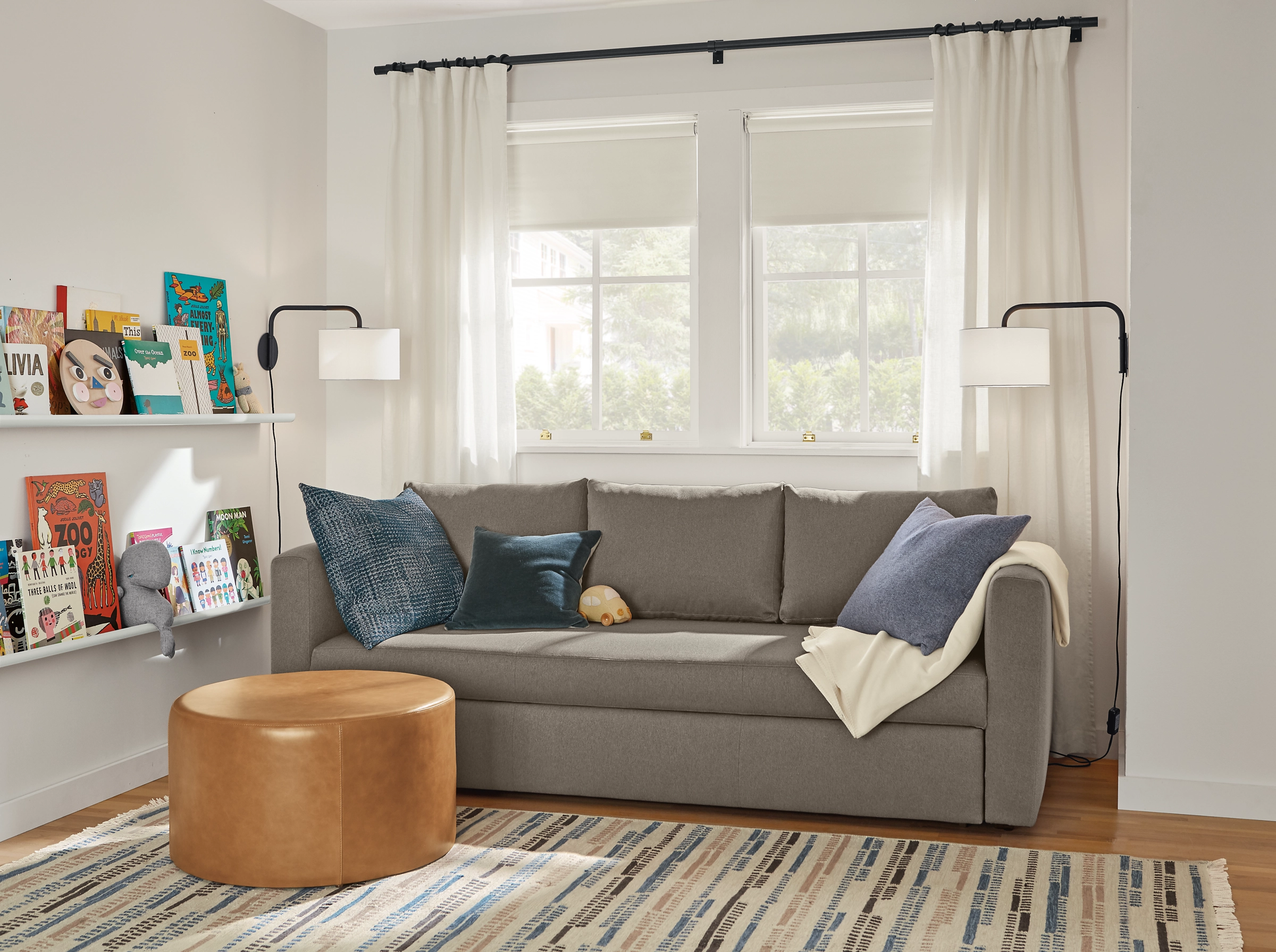 Our generously proportioned Rayne sconce does double duty by adding both downward, direct lighting and a soft, ambient glow to your room. The steel arm swivels side to side, allowing you to focus the light, and a cord-mounted dimmer switch adjusts the brightness. The Rayne sconce is topped off with a linen drum shade that adds a warm look. Mount it anywhere you need more light without taking up valuable nightstand or end table space.