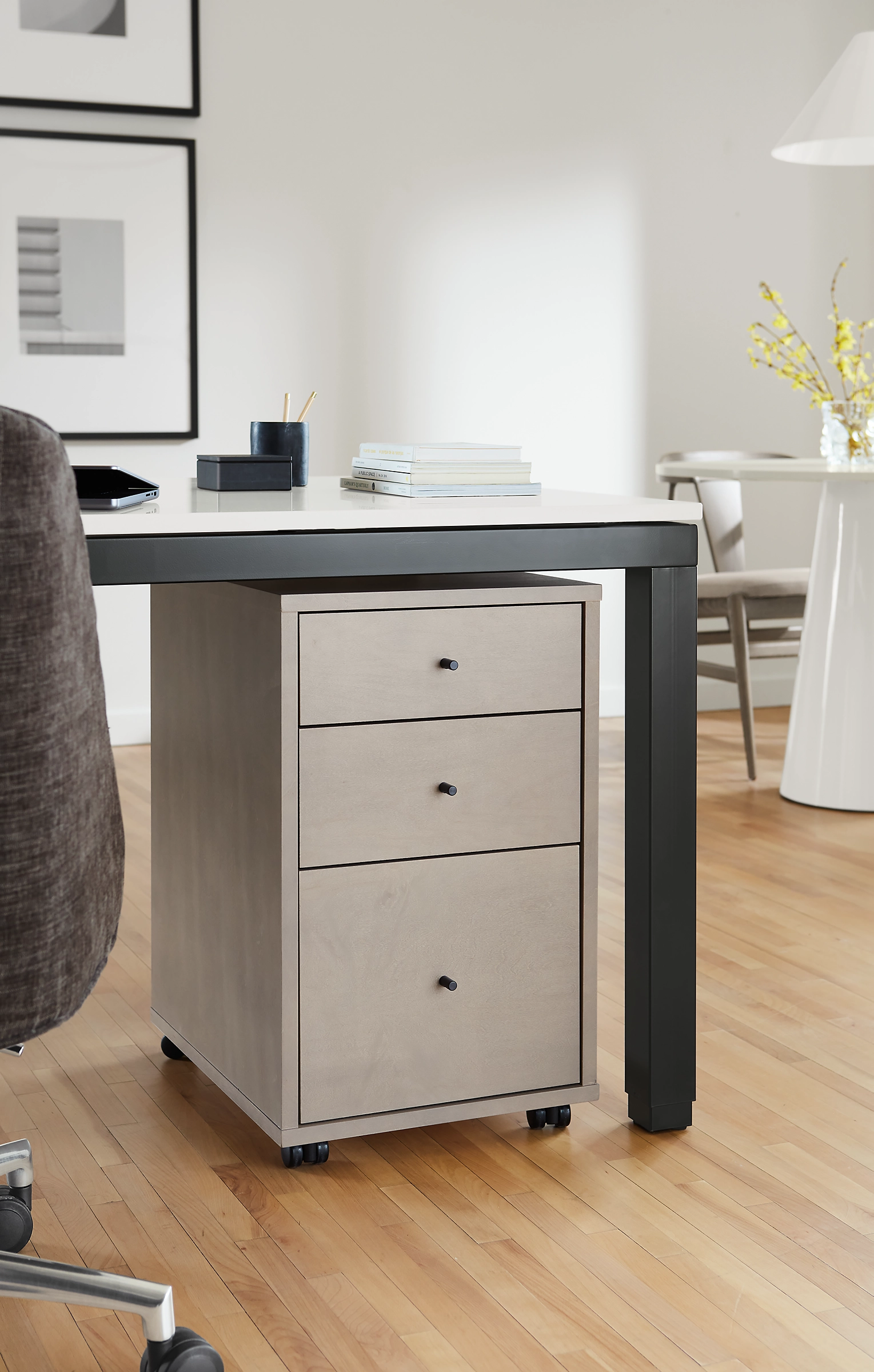 Complete your workspace with these convenient office rolling files. Simple, functional and convenient, Sequel tucks neatly under most of our desks. Generous drawers and a wheeled base keep all your files and supplies close at hand. A keyed lock option is also available; one lock on the side of the cabinet secures all three drawers.