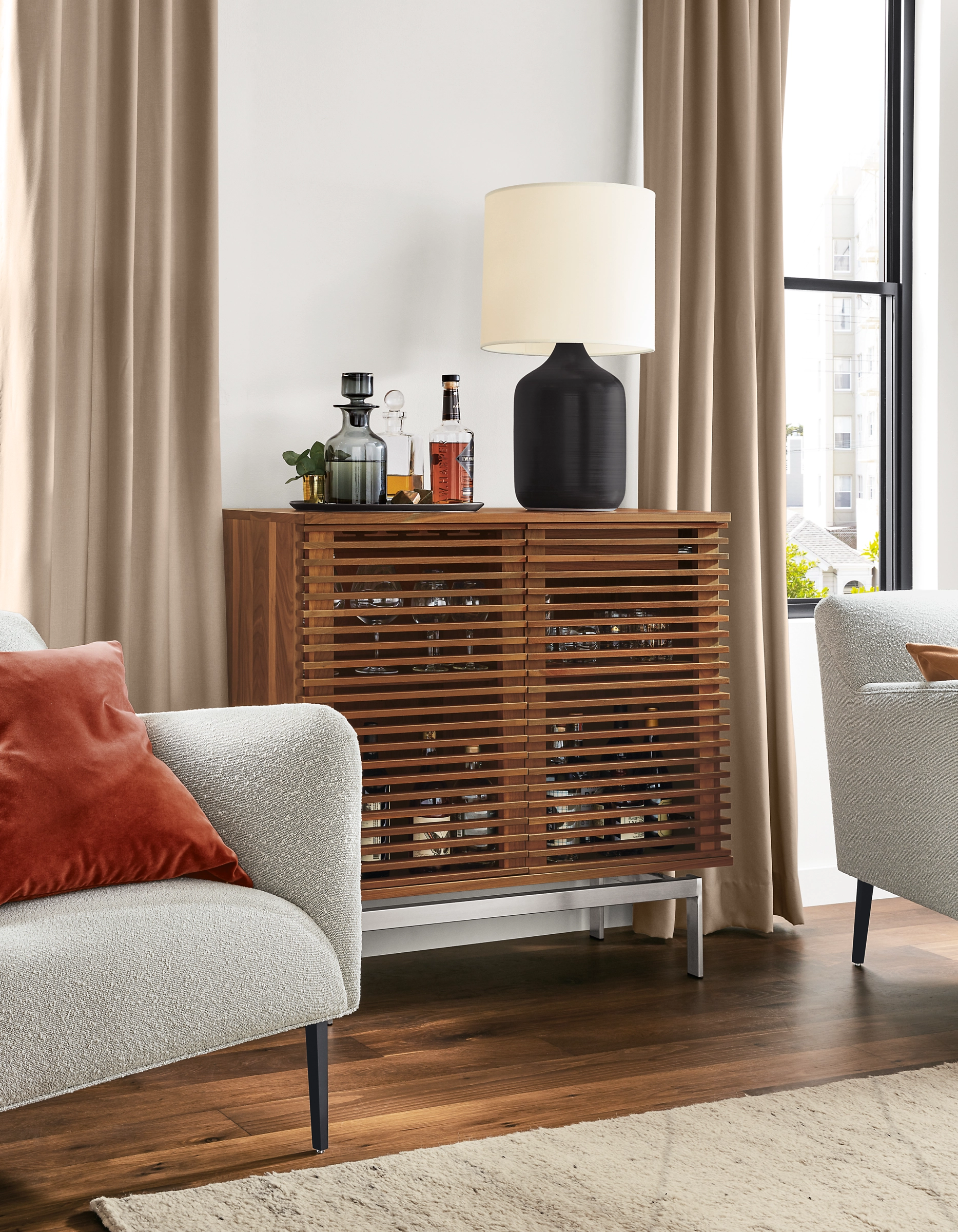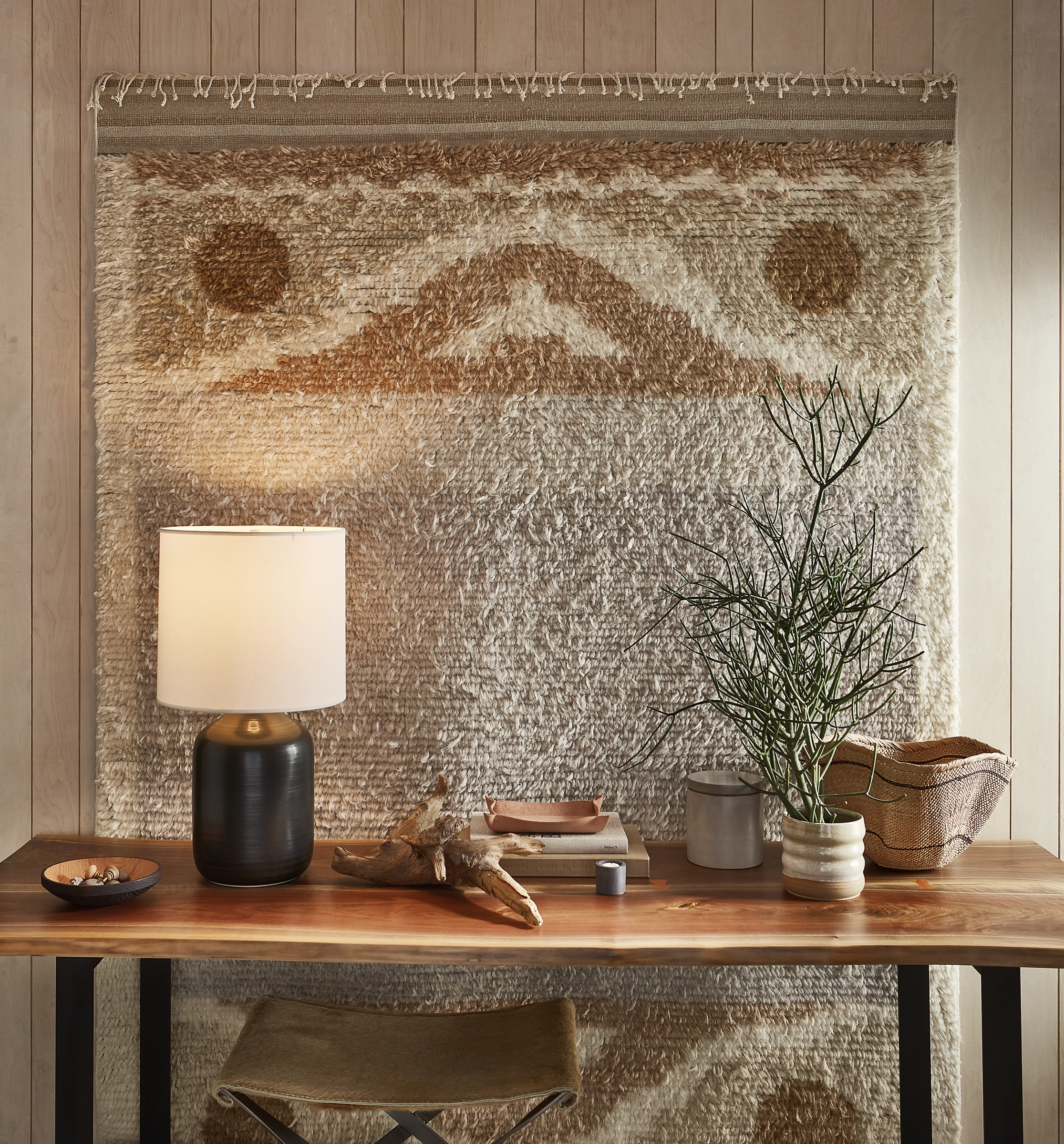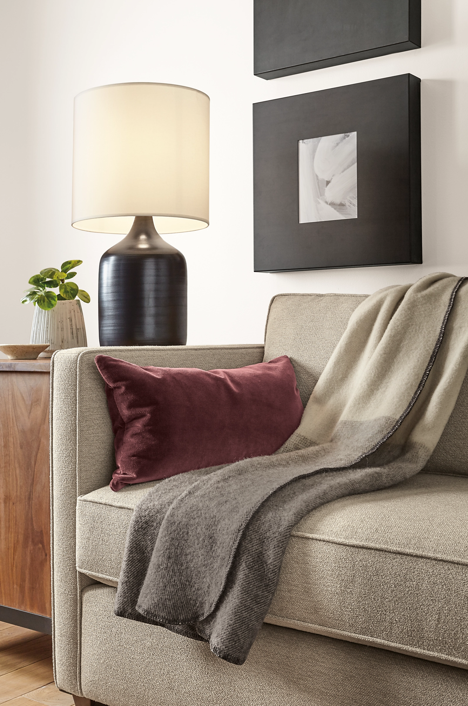 The Serena table lamp was designed for us by George Scatchard, a respected ceramic artist who has been creating clay recipes, glazes and stoneware products since the 1960s. To create this unique design, clay is poured into a mold then removed and trimmed by hand. Multiple layers of a proprietary glaze are carefully hand-brushed onto the piece in a specific order and thickness. The stoneware firing reveals the beauty of the process. A cotton shade and three-way lighting functionality give the perfect amount of light for any space.