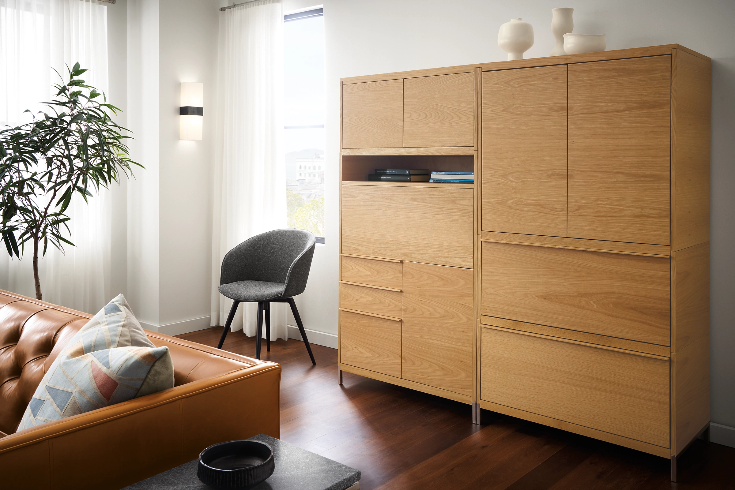 Crafted in New Hampshire from wood and steel, this sturdy modern bookcase wall unit with desk features plenty of storage in a sleek silhouette. Taylor is comprised of multiple stacked pieces, so you can reconfigure or add to it over time (not to mention it’s easier to move). Choose from a range of sizes and materials and enjoy the modularity.