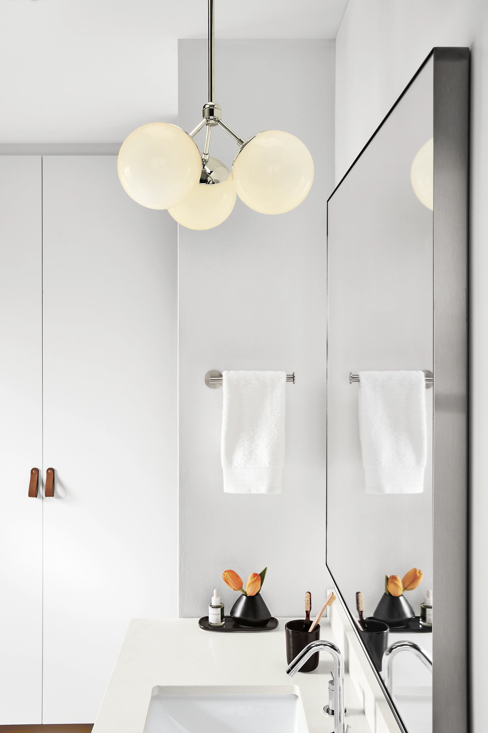 Our Triton chandelier is a stylish statement piece that leaves a memorable impression. The white glass globes have dimmable LED bulbs that provide a bright soft glow for even lighting. Dutton Brown assembles Triton by hand with the utmost care and attention to detail in their Minneapolis studio.