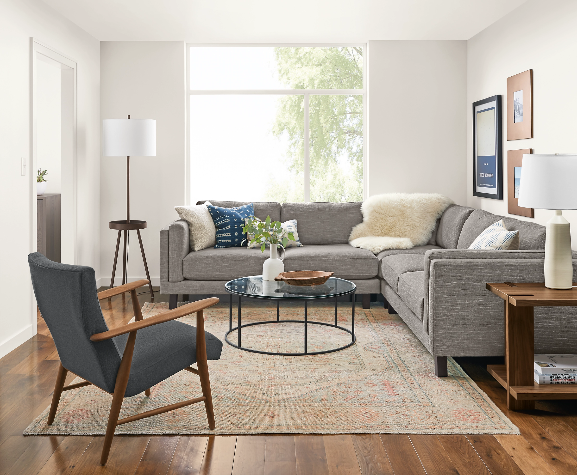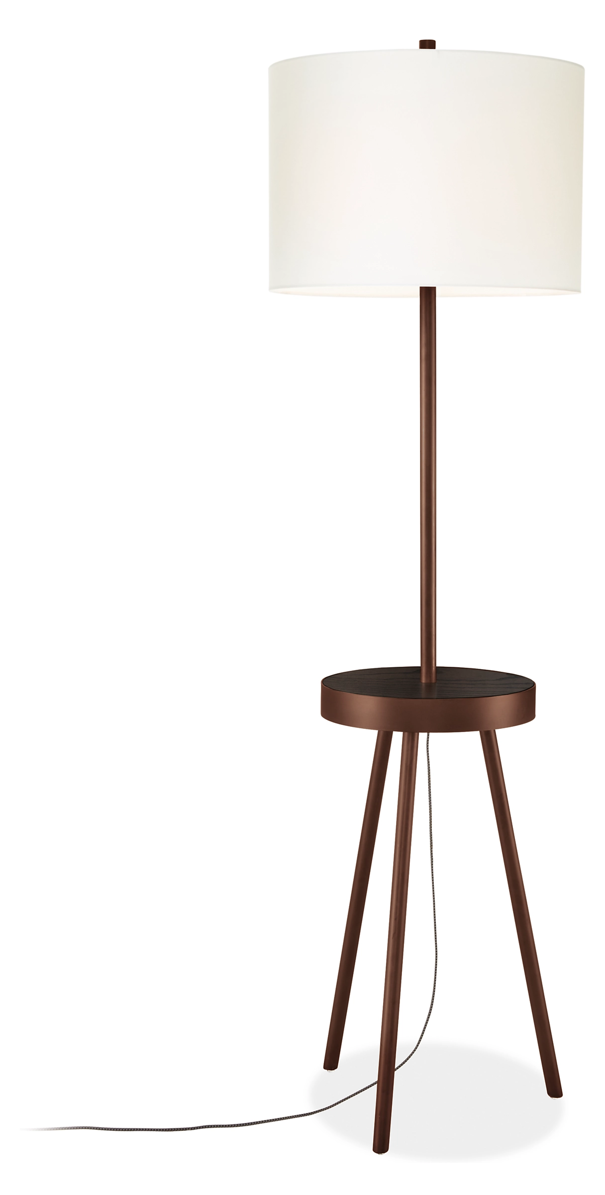 Sculptural in form and functional by design, our Winford lamp brings together the expertise of three Midwestern companies—the recycled steel base is welded in Minneapolis; the shade is assembled in Chicago; and the wooden insert is crafted in northern Wisconsin. With a 13″ round table integrated into the lamp stem, this lamp is an ideal small-space solution. The drum shade provides soft, ambient light from the included, three-way LED bulb.